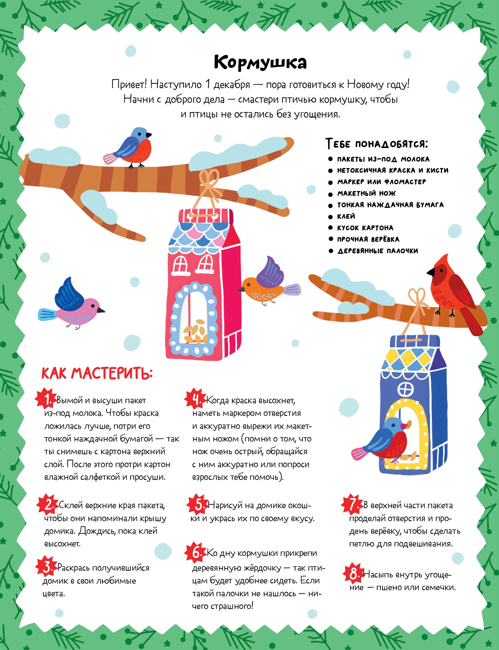 Начните декабрь с маленького доброго дела — смастерите кормушку для птиц, чтобы и пернатые во дворе не остались без угощения. Скачивайте нашу простую инструкцию и предложите ребенку самому сделать и украсить самый уютный птичий домик своими руками.