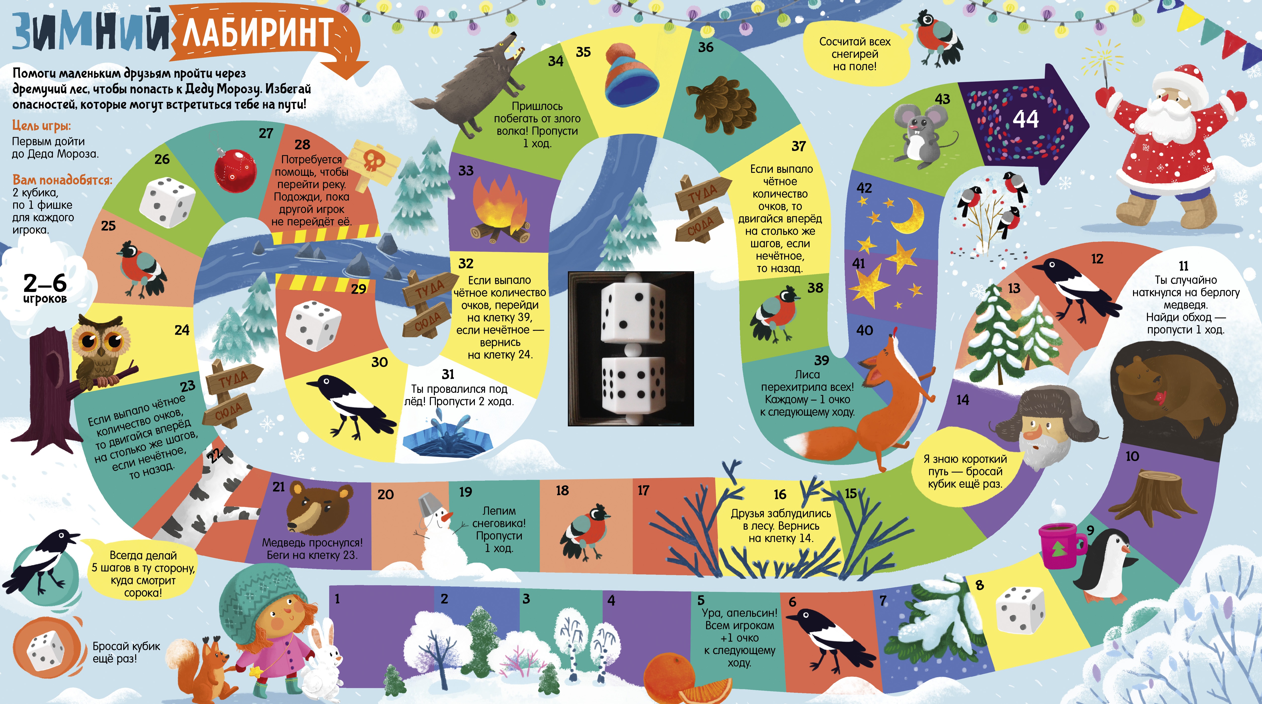 Пришло время уютных вечерних посиделок всей семей. Приготовили для вас игру, которая соберет всех за одним столом. Скачивайте наш «Зимний лабиринт», приготовьте кубик и фишки и узнайте, кто первым доберется к Деду Морозу. Берегитесь хитрой лисы и не наткнитесь на медвежью берлогу по пути!