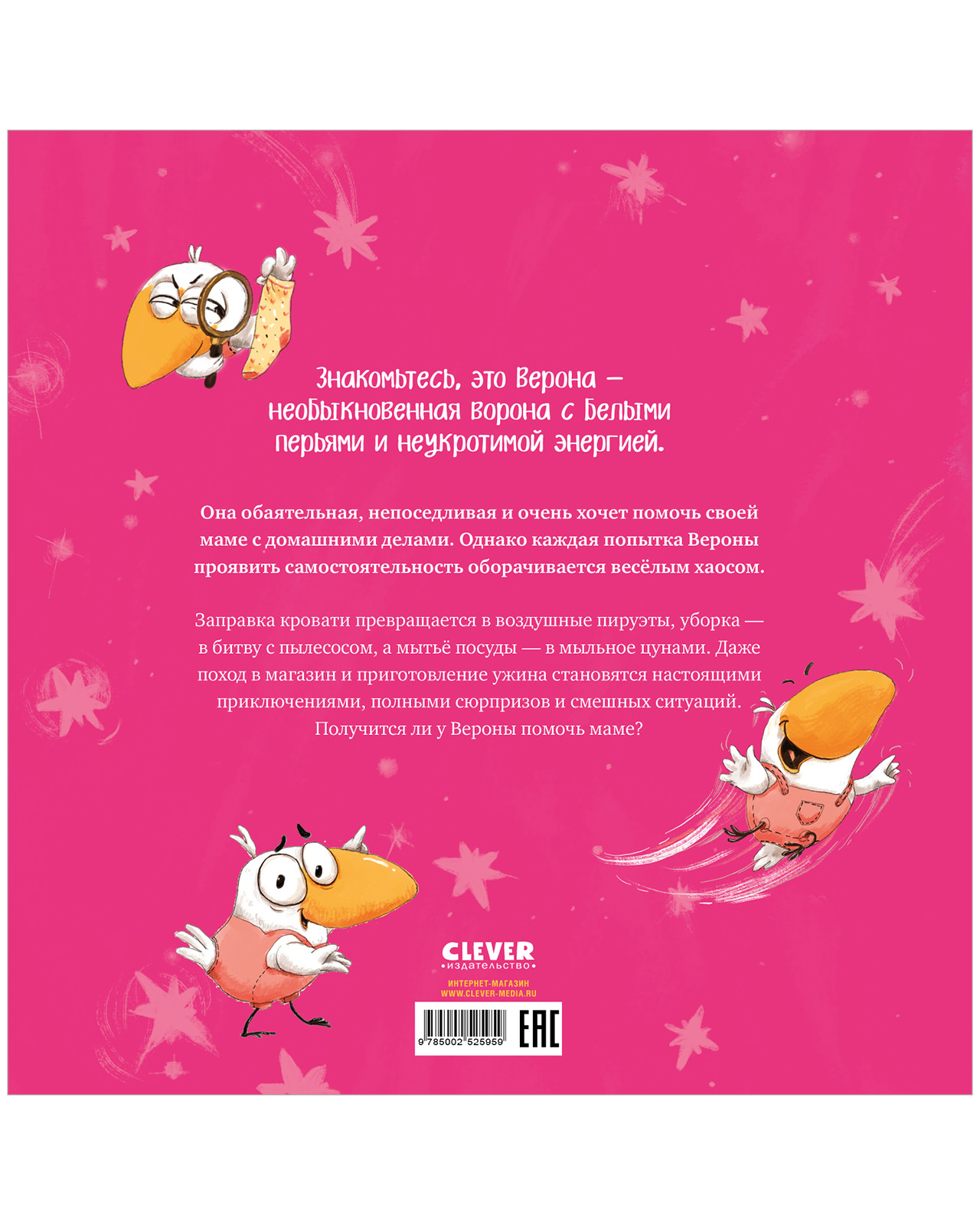 Знакомьтесь, это Верона — необыкновенная ворона с белыми перьями и неукротимой энергией. Она обаятельная, непоседливая и очень хочет помочь своей маме с домашними делами. Однако каждая попытка Вероны проявить самостоятельность оборачивается веселым хаосом.