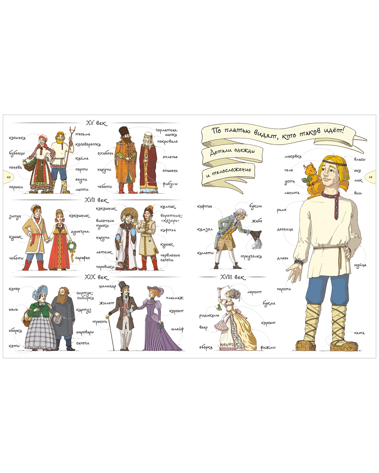 «Как жили, говорили и одевались на Руси. Игровой словарь в картинках» — необычная и увлекательная книга, которая наглядно познакомит ребенка с редкими и устаревшими словами. Это отличный помощник на уроках литературы. Вместо сложных описаний — яркие детальные картинки, которые погружают в прошедшие эпохи.