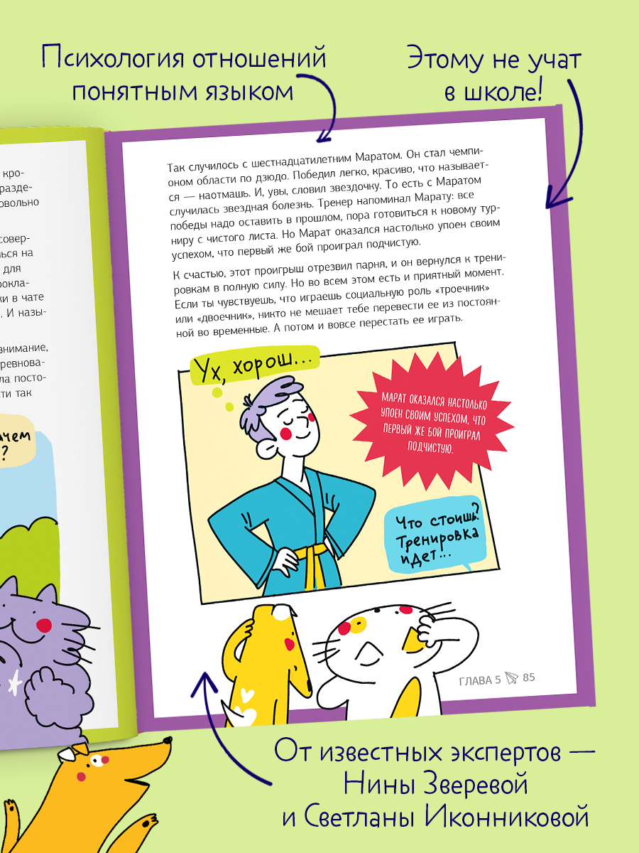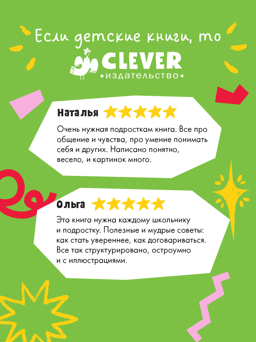 Как научиться слушать себя и других, понимать себя и других, вырастить социальный капитал, не ссориться, избавиться от застенчивости, как слушать себя и не зависеть от чужого мнения, как стать харизматичным человеком и многое другое на страницах книги для детей, книги для подростков, яркой и полезной Clever книги.