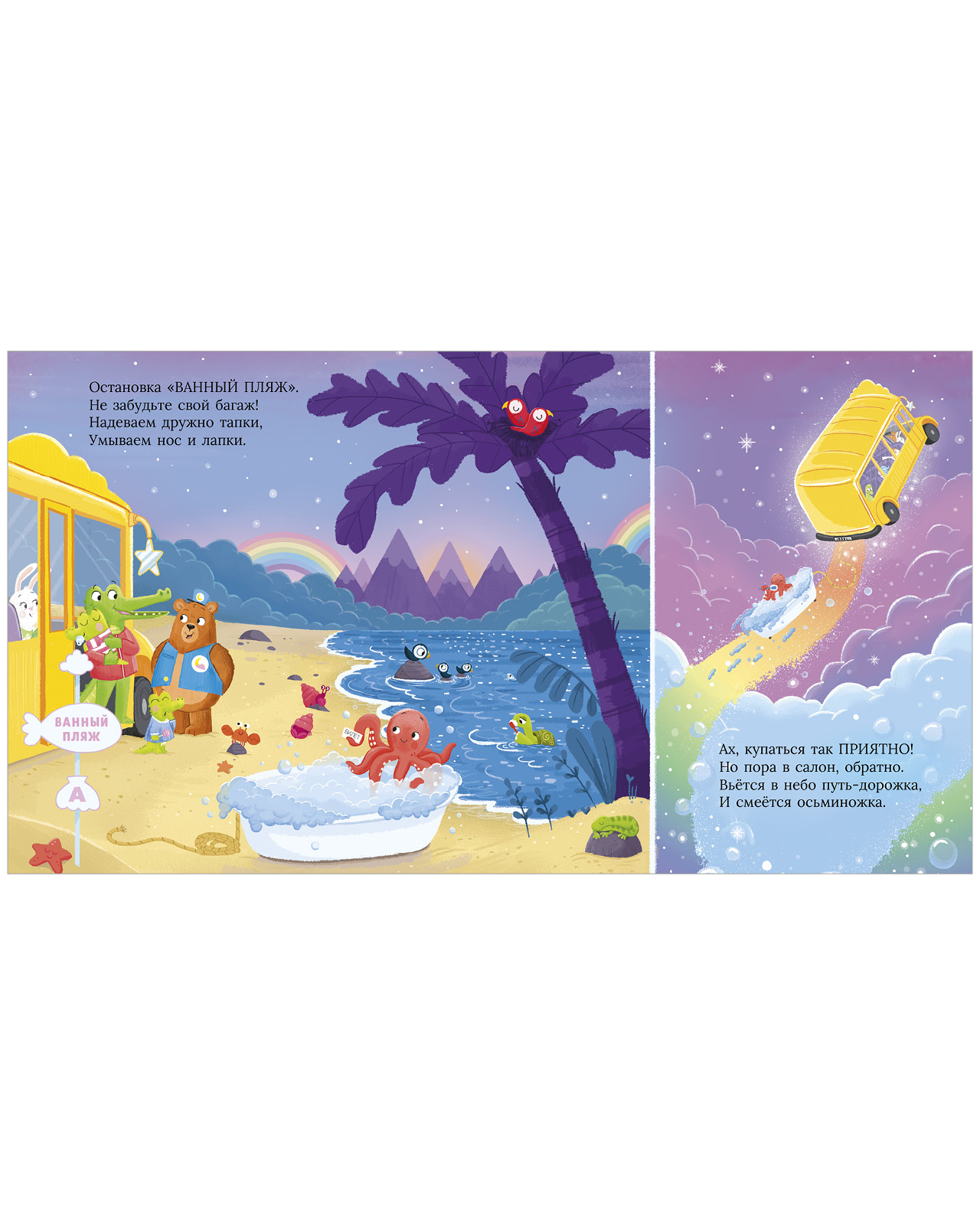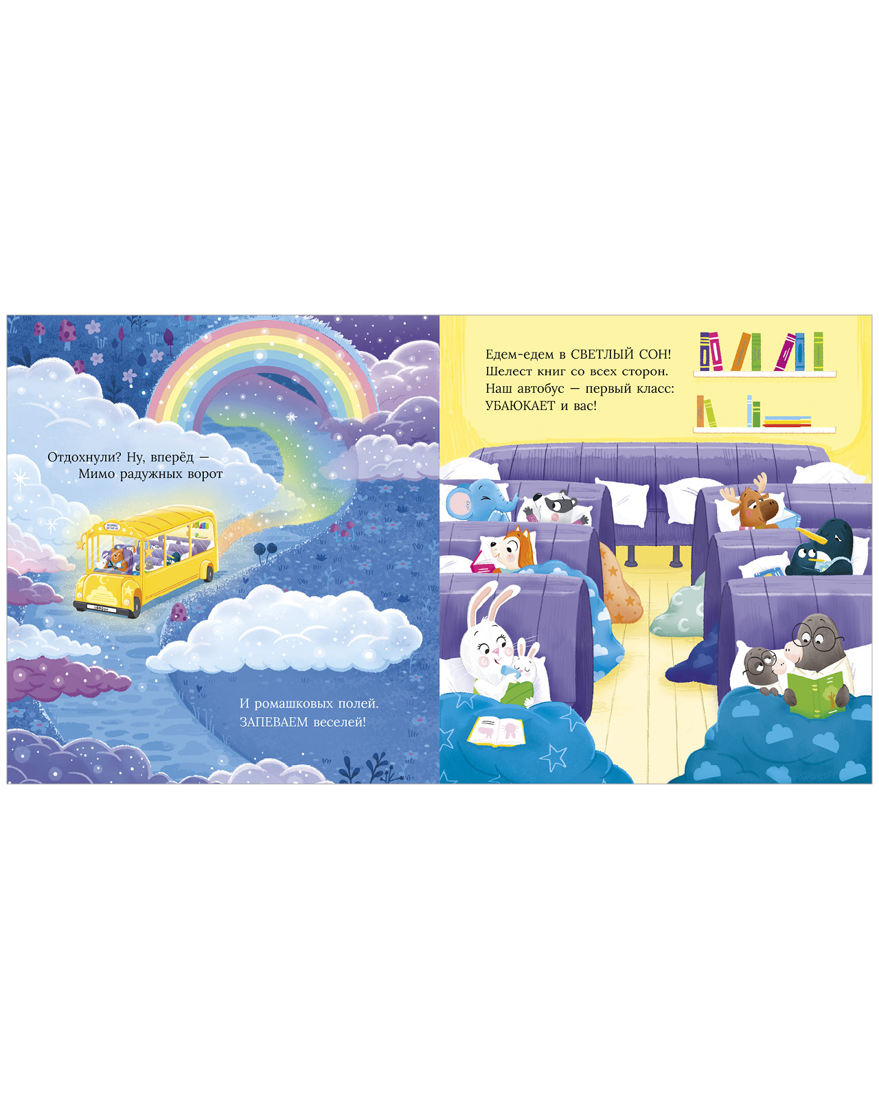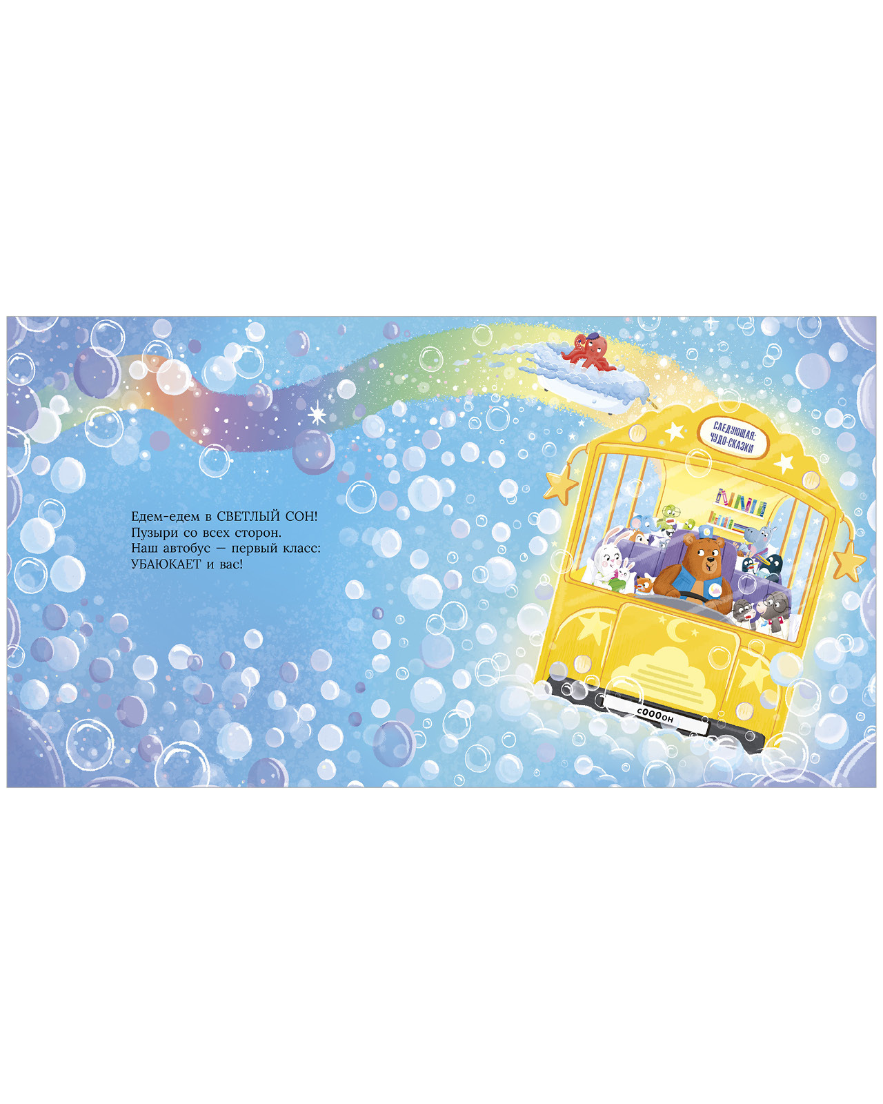 Вместе с пассажирами этого необычного автобуса вы побываете на станциях «Ванный пляж», «Чудо-сказки» и «Светлый сон», а конечная в этом увлекательном путешествии — теплая и уютная кроватка. Волшебные, нежные иллюстрации, убаюкивающие стихи — то, что нужно для спокойного засыпания.