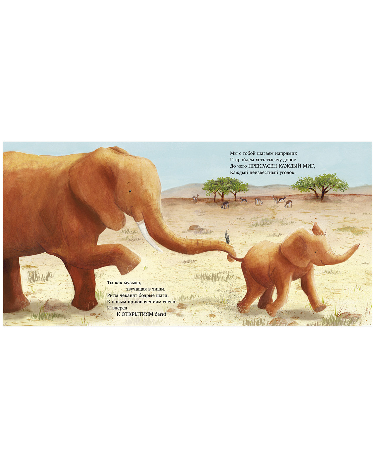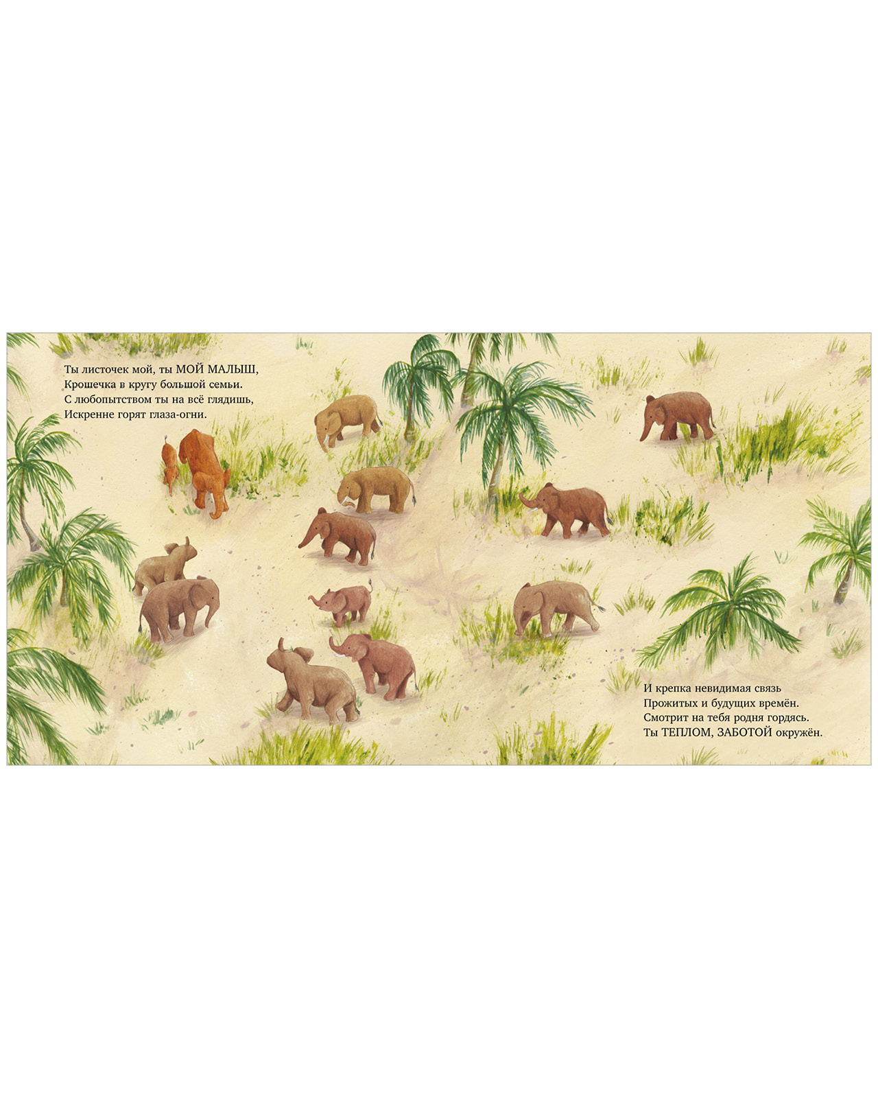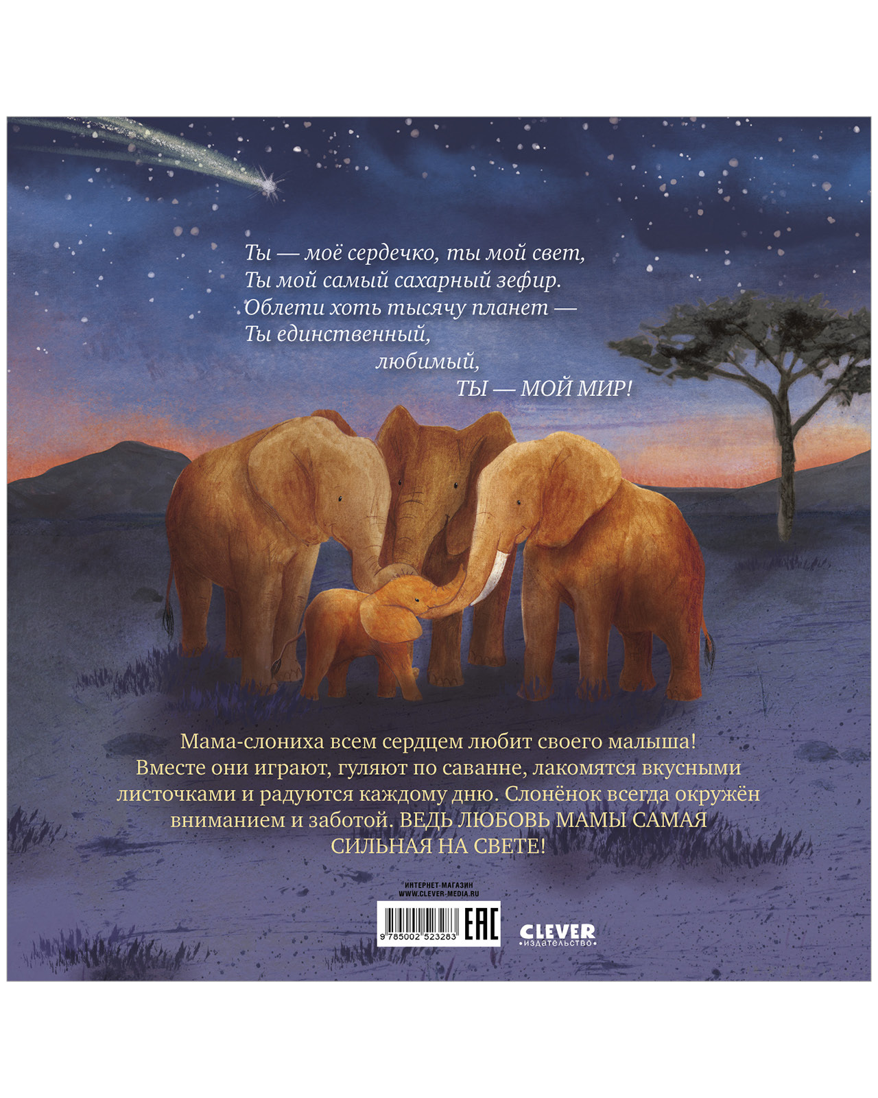 Мама-слониха всем сердцем любит своего малыша! Вместе они играют, гуляют по саванне, лакомятся вкусными листочками и радуются каждому дню. Слоненок всегда окружен вниманием и заботой. Ведь любовь мамы самая сильная на свете!
