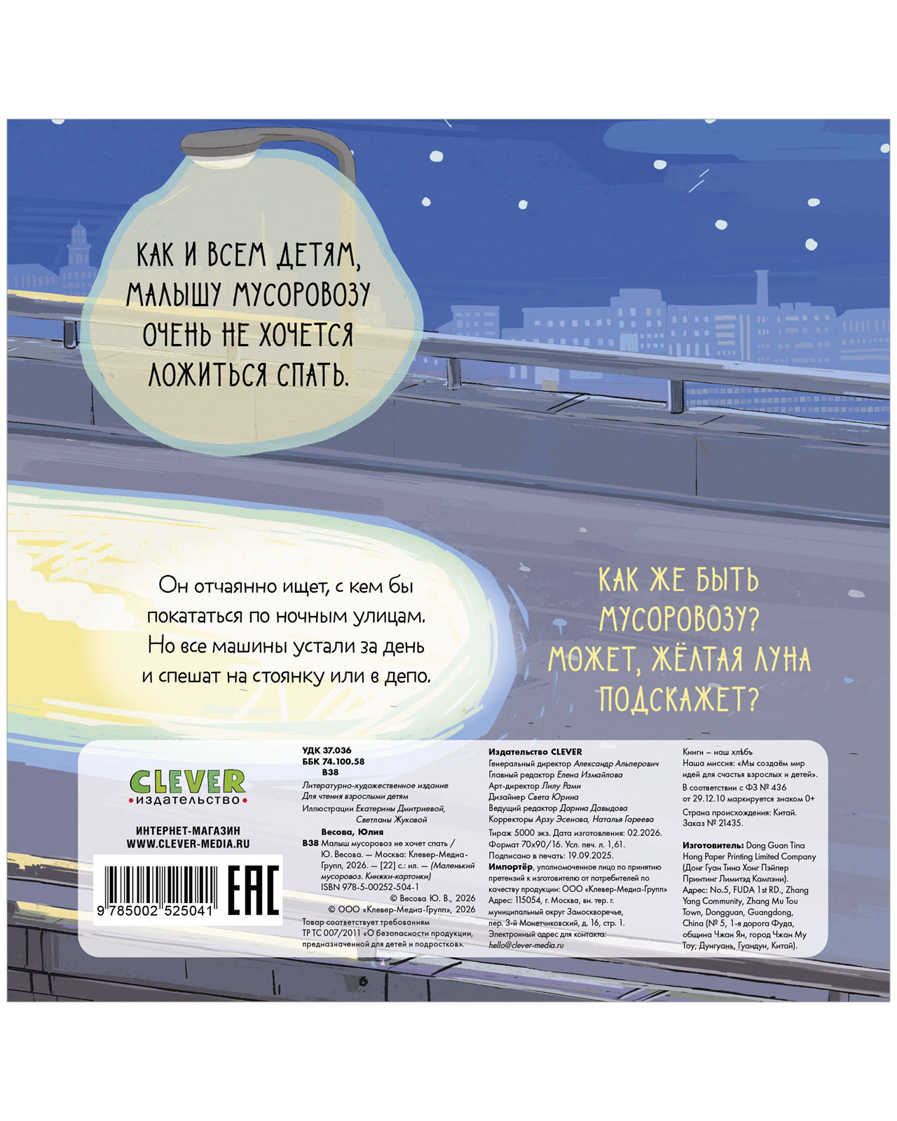 «Малыш мусоровоз не хочет спать» — уютная история в стихах, которая поможет ребенку настроиться на сон. Мягкие дружелюбные иллюстрации и убаюкивающие стихи Юлии Весовой превратят засыпание в приятный ритуал!