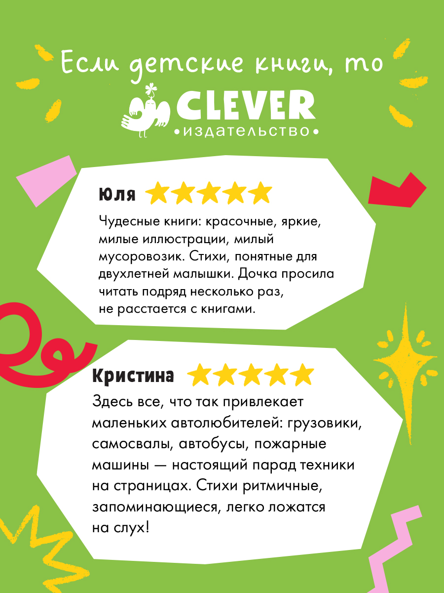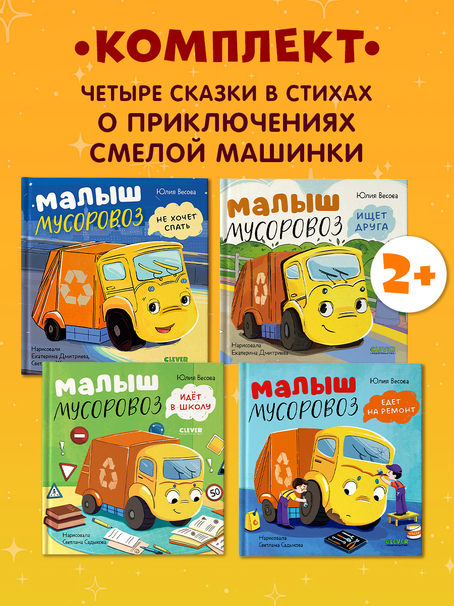 Четыре книжки для малышей в комплекте, четыре увлекательные истории о малыше мусоровозе — веселые приключения машинок, много нового для изучения, ритмичные стихи и яркие картинки.