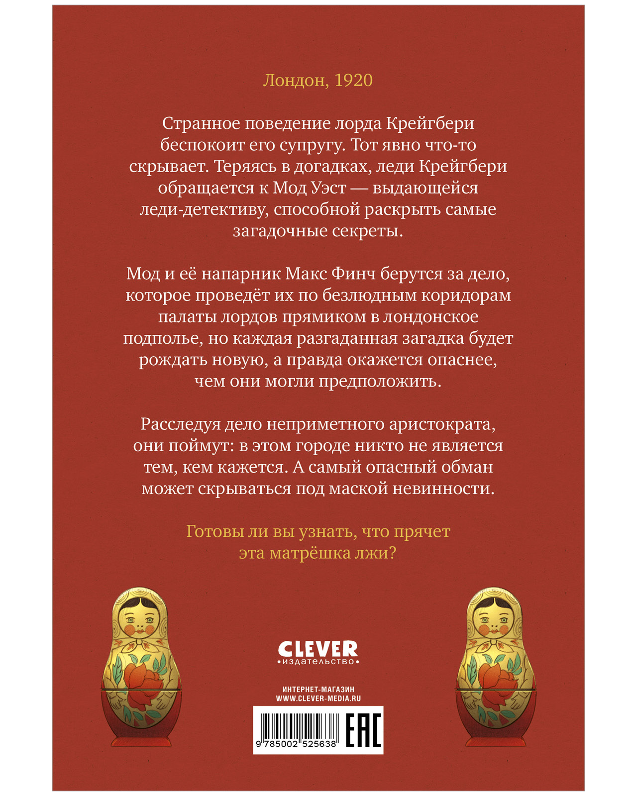 Сюжет Clever книги захватит с первых страниц: лорд Крейгбери явно что-то скрывает. В этом уверена его супруга, которая и обращается к Мод Уэст — выдающейся леди-детективу, способной раскрыть самые загадочные секреты. Мод и её напарник Макс Финч берутся за дело, которое проведет их по безлюдным коридорам палаты лордов прямиком в лондонское подполье, но каждая разгаданная загадка будет рождать новую, а правда окажется опаснее, чем они могли предположить. Расследуя дело неприметного аристократа, они поймут: в этом городе никто не является тем, кем кажется. А самый опасный обман может скрываться под маской невинности. Готовы ли вы узнать, что прячет эта матрешка лжи?
