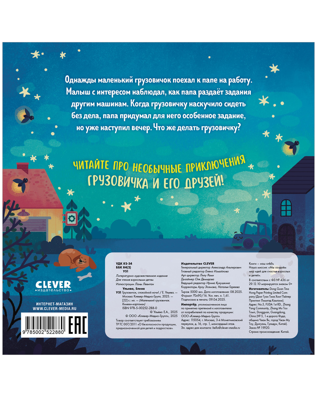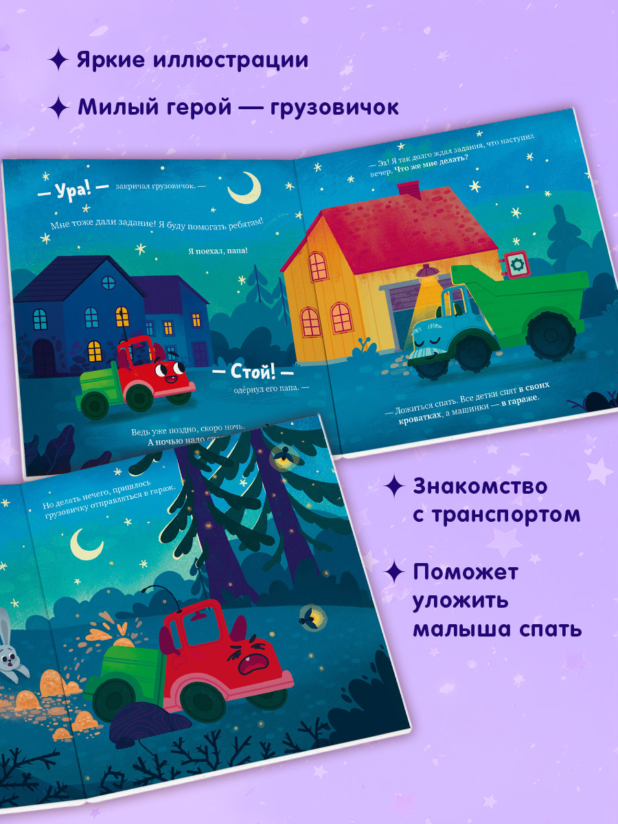 «Грузовичок, спокойной ночи!» — добрая познавательная сказка Елены Ульевой про любимого малышами героя. Эта книга может стать прекрасным засыпательным ритуалом. А удобный для рук малыша формат книжки-картонки позволит легко листать плотные странички книги для малышей, развивая мелкую моторику.