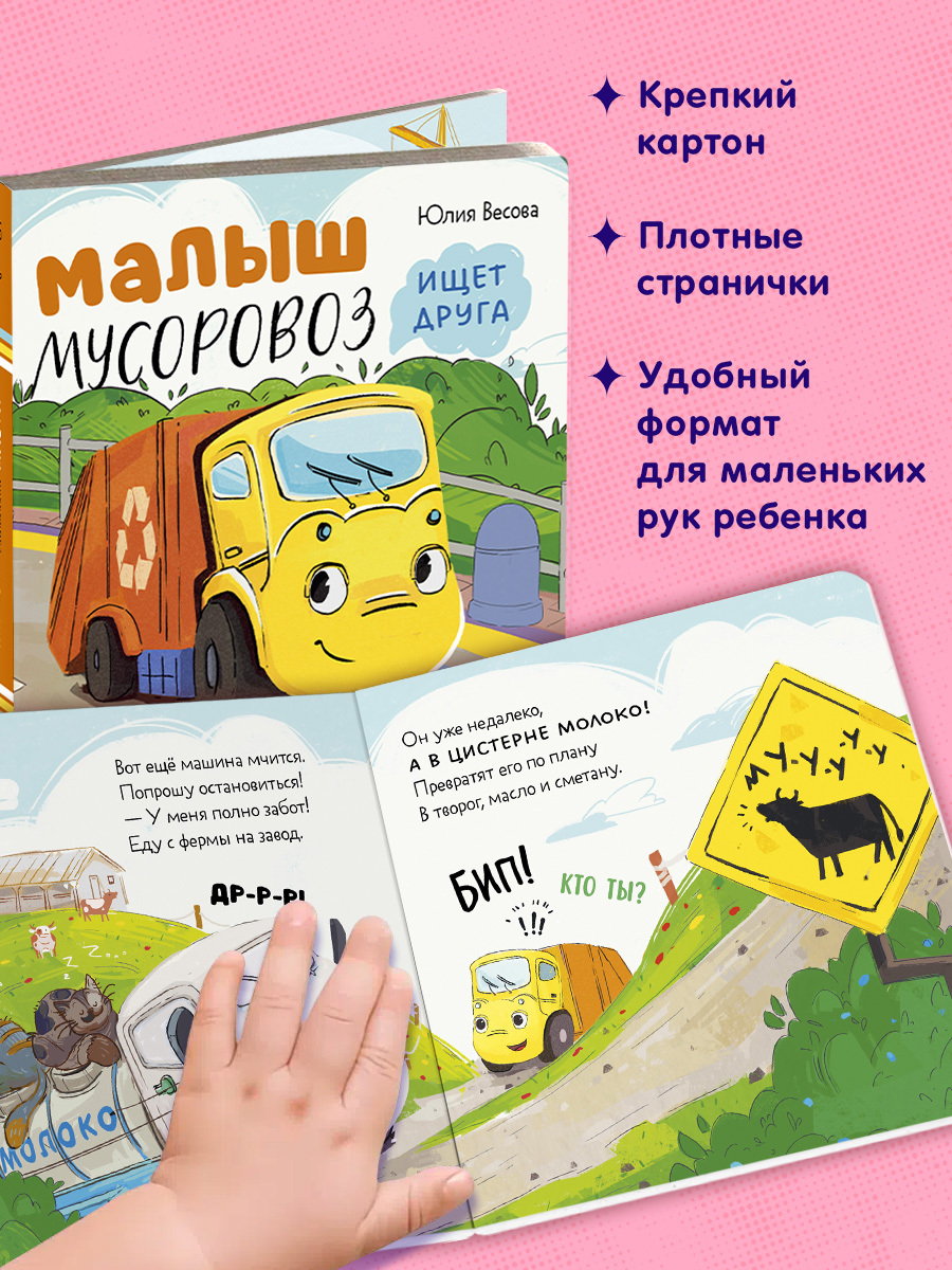 «Малыш мусоровоз ищет друга» выходит в формате книжки-картонки. Плотные странички удобно листать малышу, развивая мелкую моторику. Такие книжки для малышей от года отлично подходят для первого чтения и для игры, это прекрасный подарок ребенку 2 года и, конечно, новогодний подарок для детей.