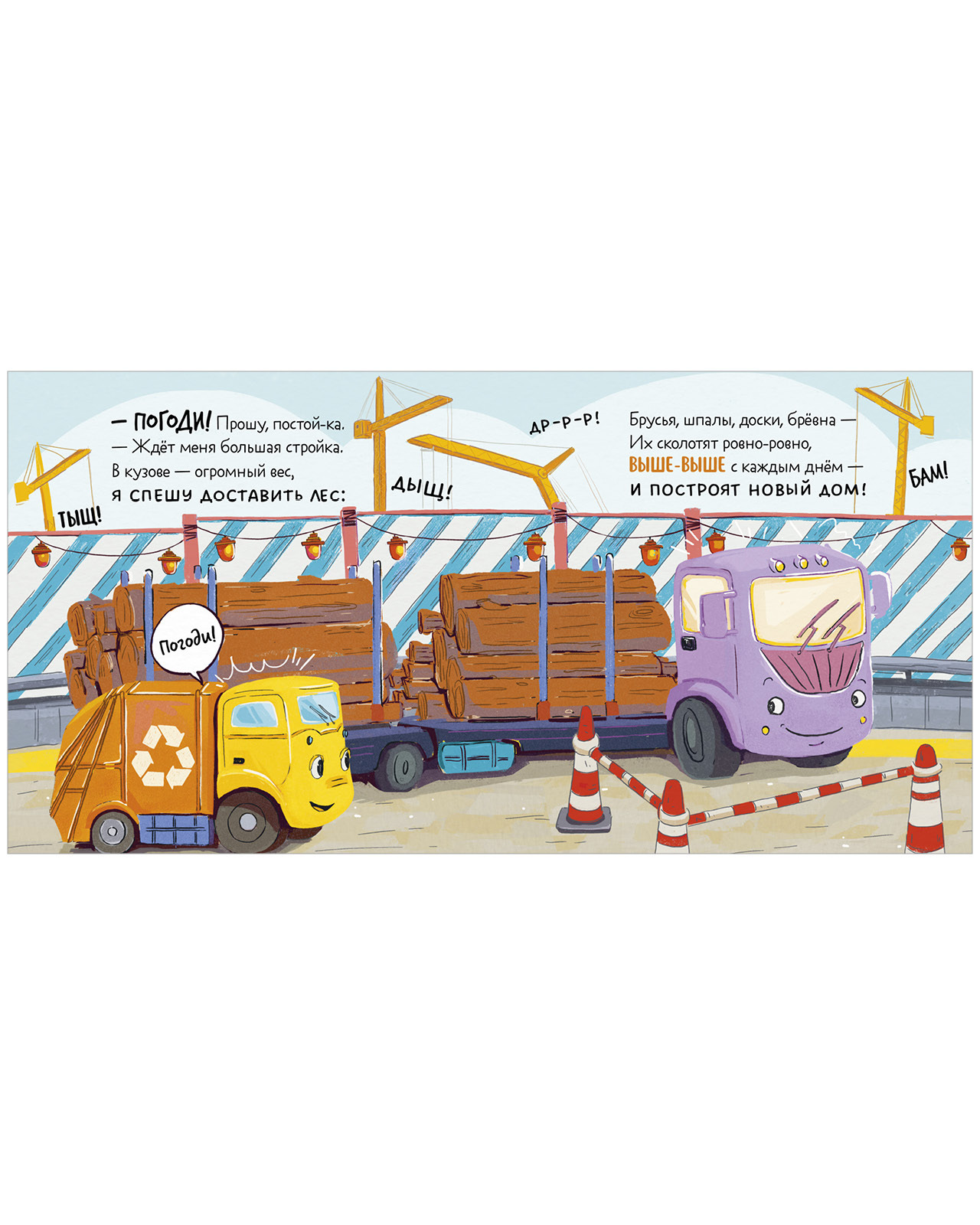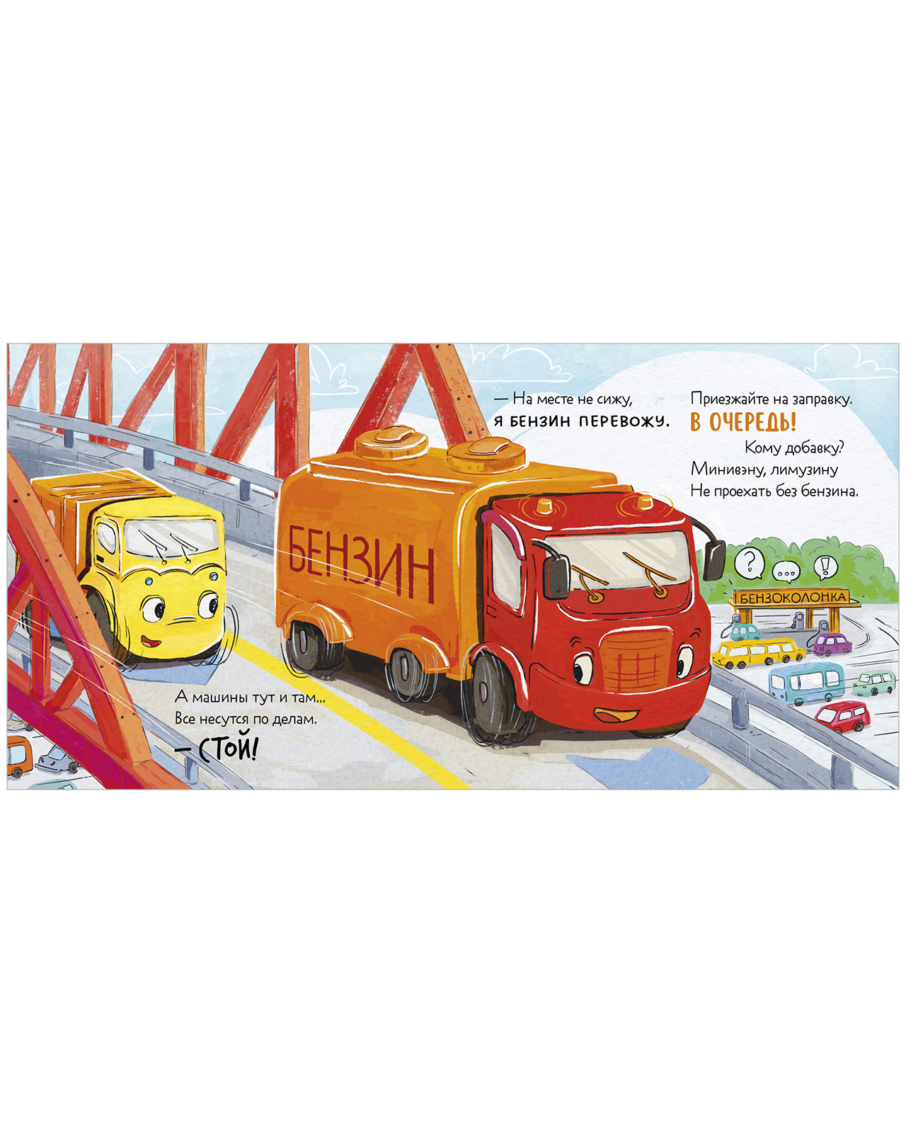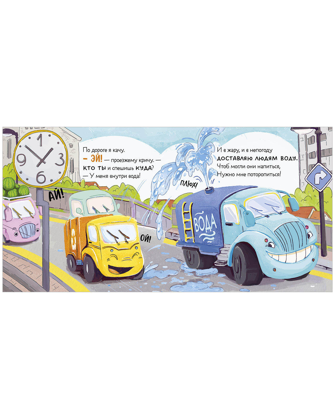 Малыш мусоровоз хочет найти друзей. Он знакомится с большими машинами-помощниками. Водовоз, лесовоз, бензовоз, молоковоз… Названия похожи, вот только им совсем не интересно дружить с малышом, да и своих забот полный кузов! Получится ли у мусоровоза найти друга?