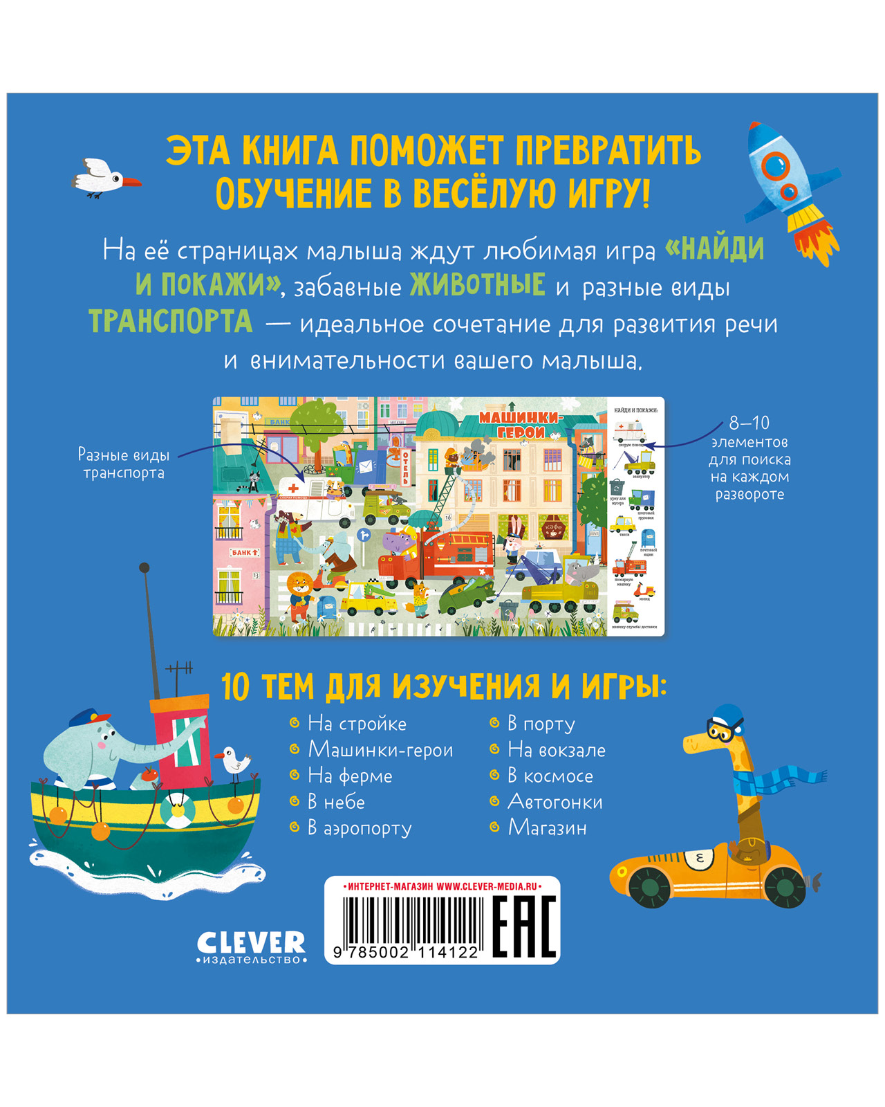 Эта книга поможет превратить обучение в весёлую игру! На её страницах малыша ждут любимая игра «найди и покажи», забавные животные и разные виды транспорта - идеальное сочетание для развития речи и внимательности вашего малыша.