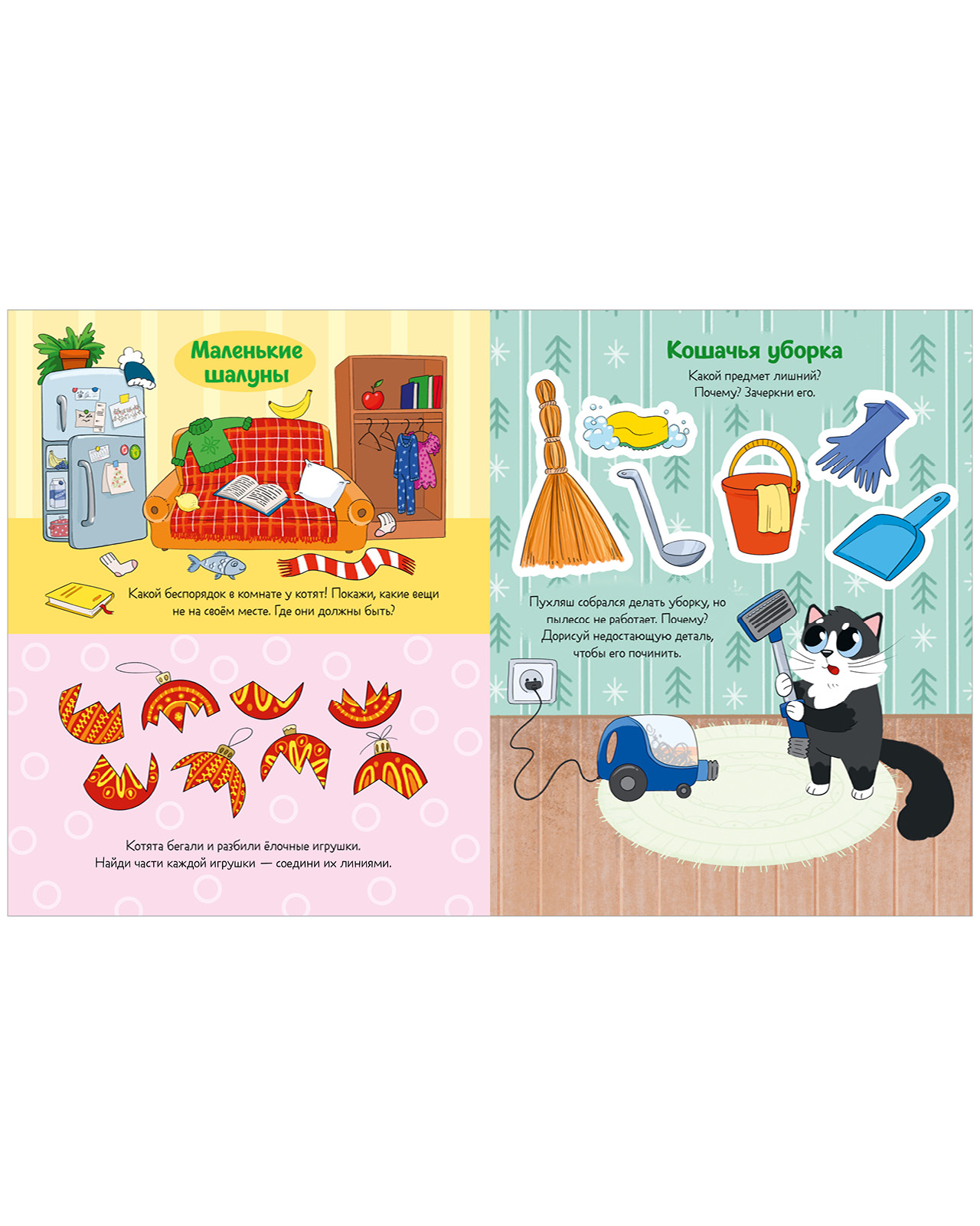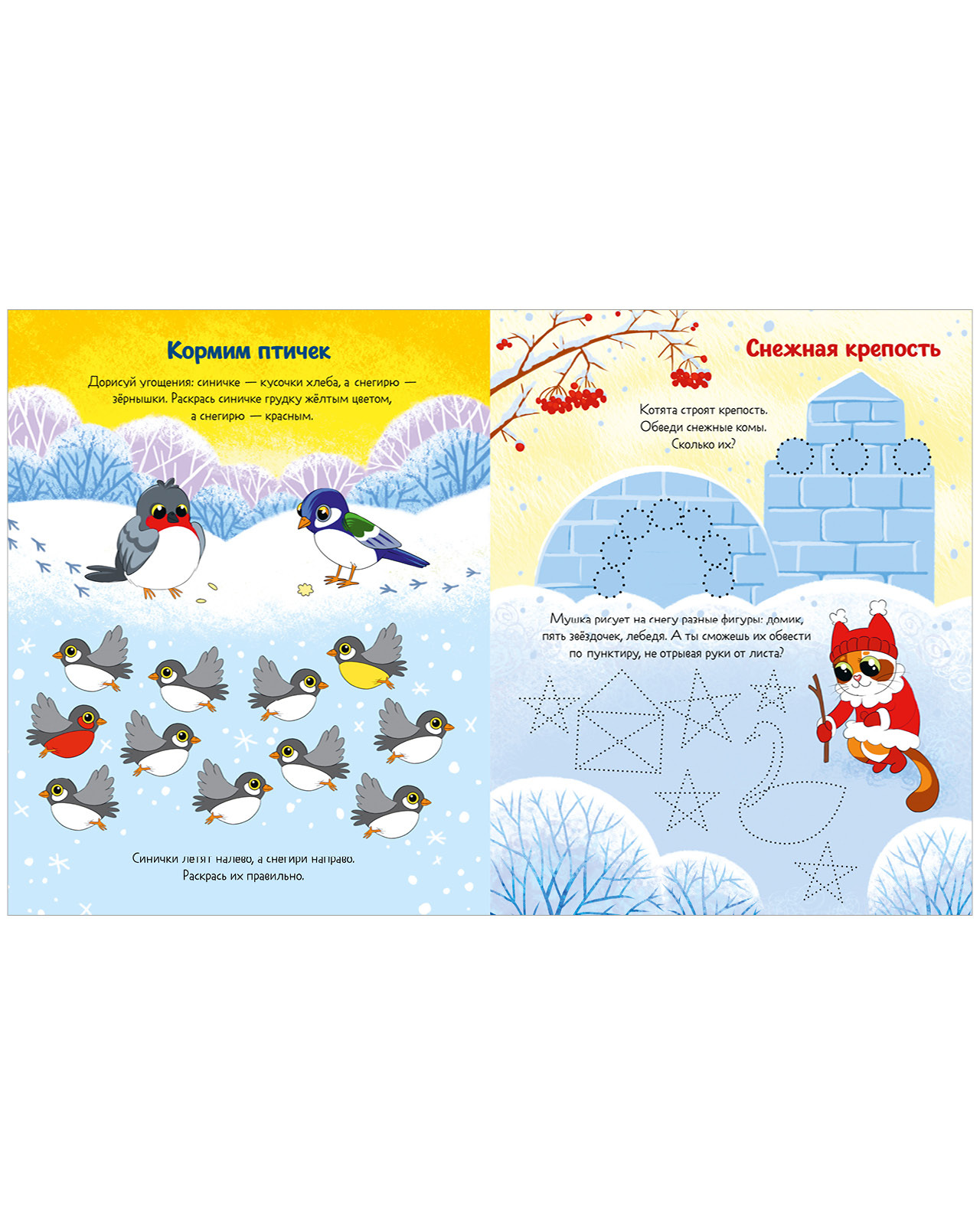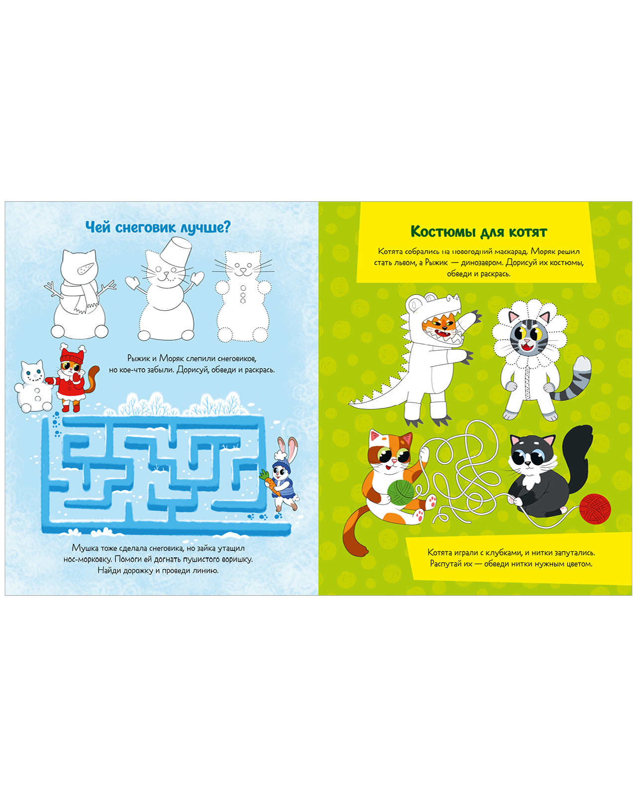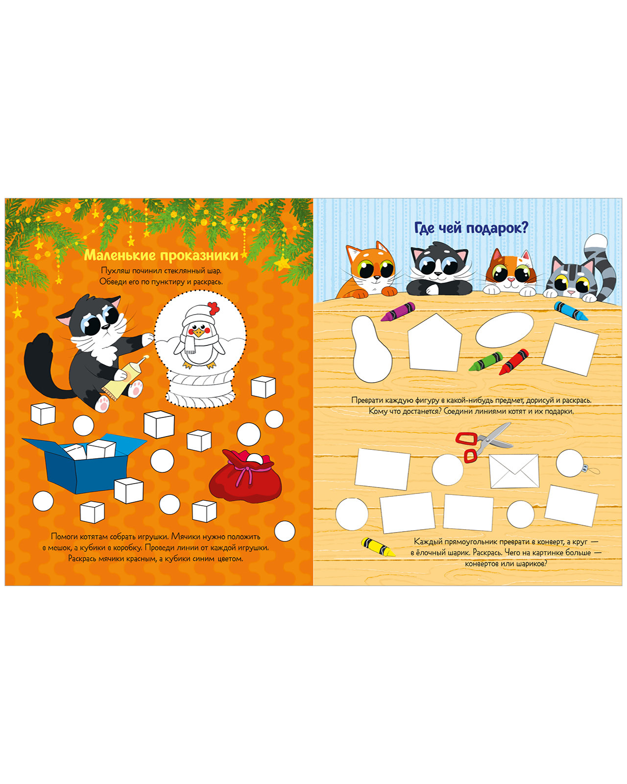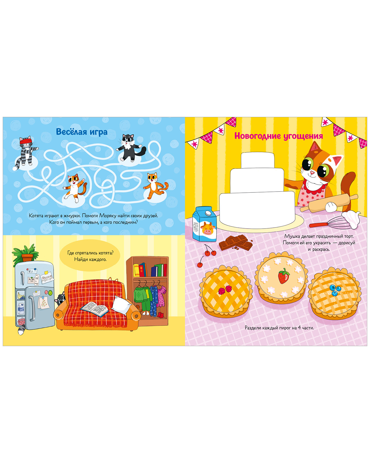 Встречайте Новый год весело в компании озорных котят! Вместе с ними интересно искать выход из лабиринта к сказочному терему, раскрашивать елочные игрушки и праздничные угощения, играть в «найди и покажи», находить потерянные предметы. А еще написать на красивом листке-конверте свое письмо Деду Морозу и отправить его!
