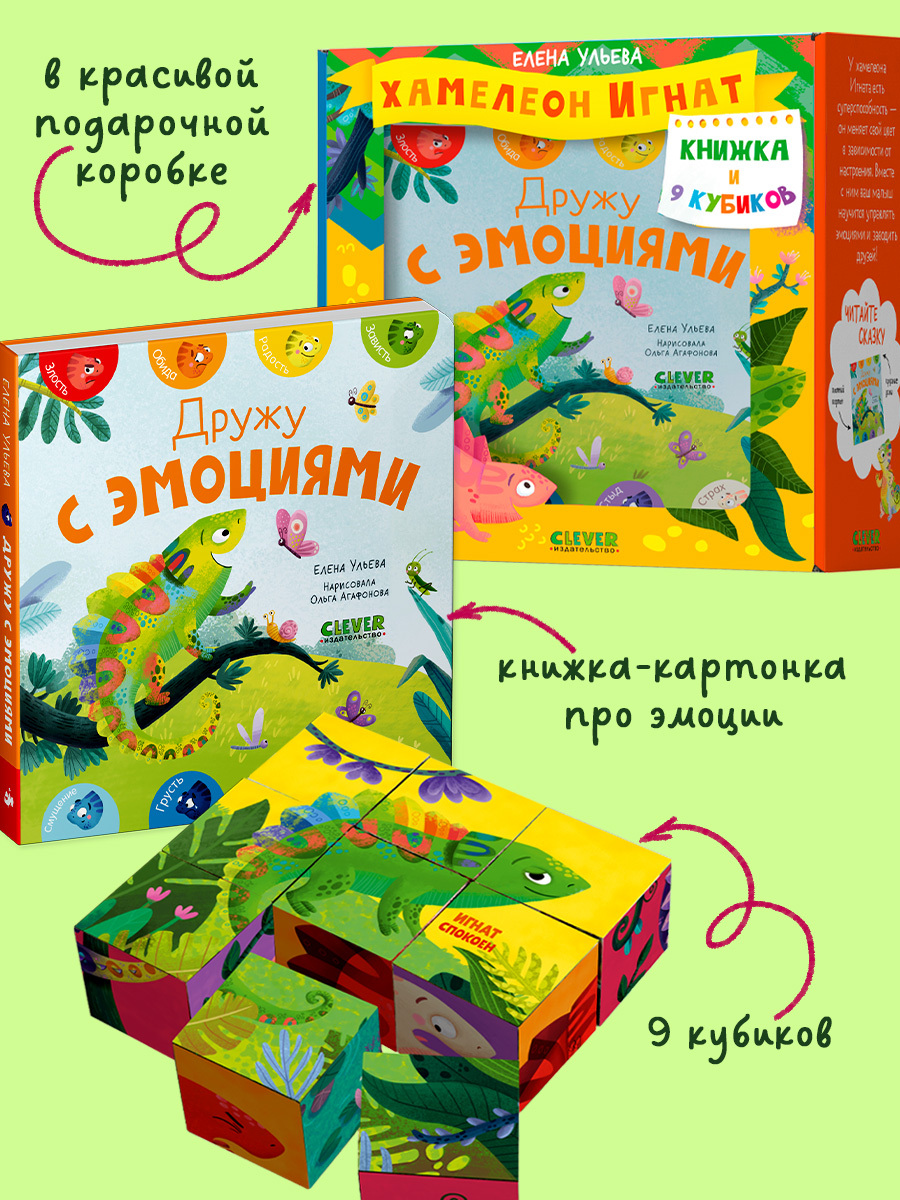 «Хамелеон Игнат. Книжка и 9 кубиков» — это подарочный набор для малышей от 0 до 2 лет. Книжка-картонка о хамелеоне Игнате поможет ребенку познакомиться и подружиться со своими эмоциями, а из кубиков можно собрать 6 ярких картинок с разными эмоциями, научиться их определять и потренировать мелкую моторику.