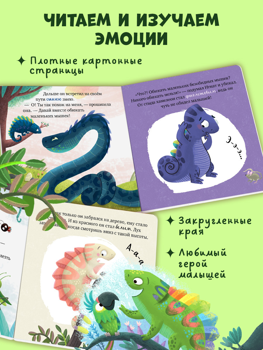 У хамелеона Игната есть суперспособность — он меняет свой цвет в зависимости от настроения. Вместе с ним ваш малыш научится управлять эмоциями и заводить друзей!
