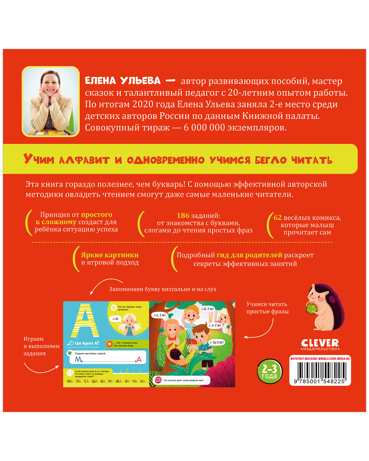 Елена Ульева - автор развивающих пособий, мастер сказок и талантливый педагог с 20-летним опытом работы. По итогам 2020 года Елена Ульева заняла 2-е место среди детских авторов России по данным Книжной палаты. Совокупный тираж - 6 000 000 экземпляров. Учим алфавит и одновременно учимся бегло читать Эта книга гораздо полезнее, чем букварь! С помощью эффективной авторской методики овладеть чтением смогут даже самые маленькие читатели. Принцип от простого к сложному создаст для ребёнка ситуацию успеха. 186 заданий от знакомства с буквами, слогами до чтения простых фраз, 62 весёлых комикса, которые малыш прочитает сам. Яркие картинки и игровой подход. Подробный гид для родителей раскроет секреты эффективных занятий Запоминаем букву визуально и на слух. Играем и выполняем задания. Учимся читать простые фразы 2-3 года