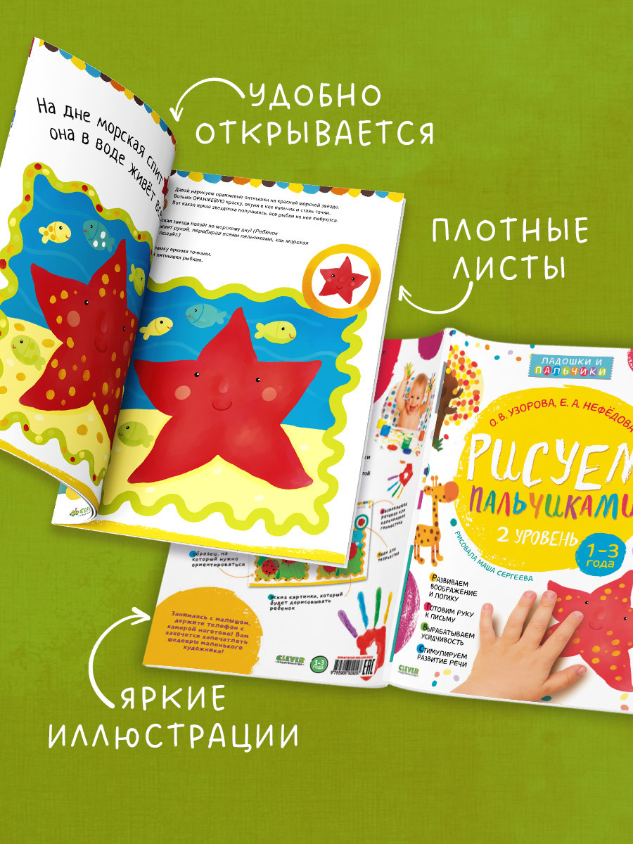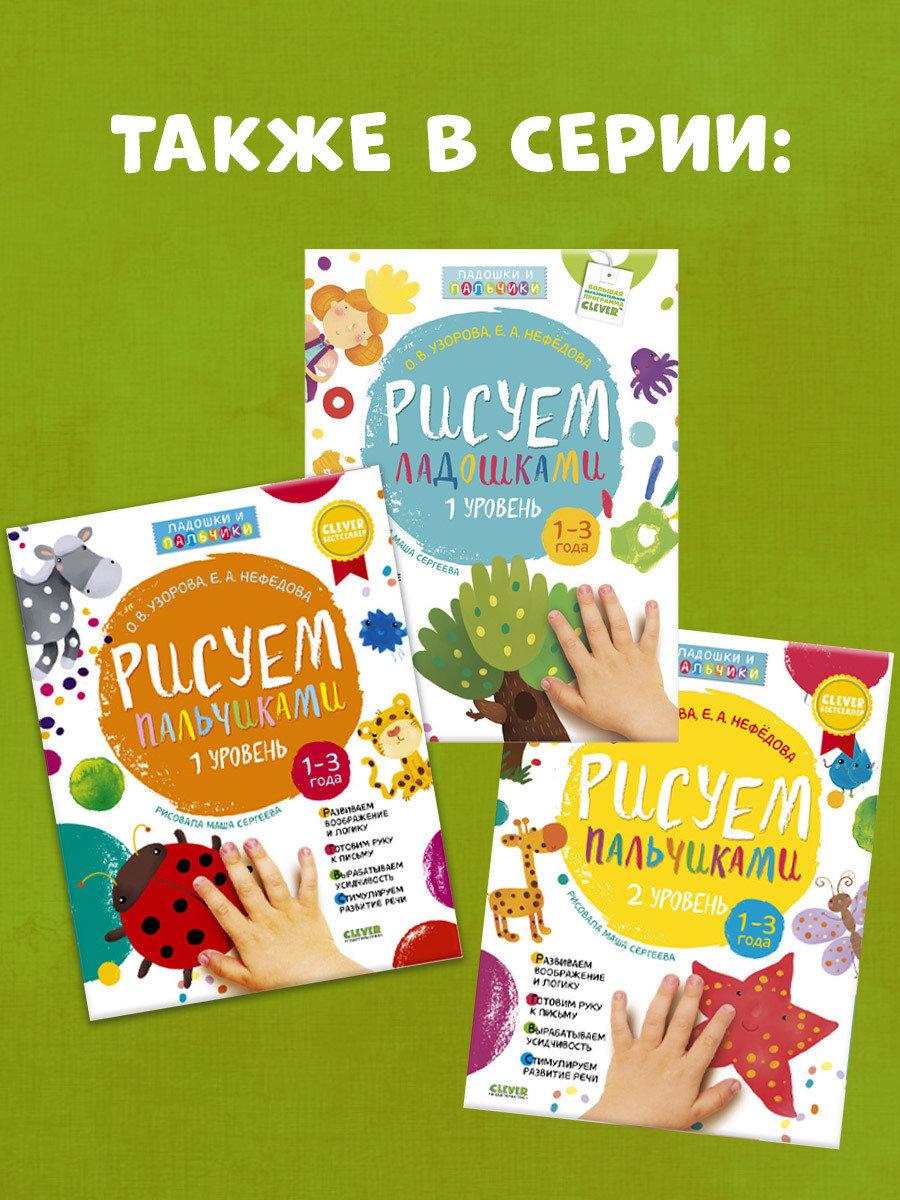 Малыши любят рисовать руками, ведь именно так они чувствуют свое творчество, а в это время их пальчики развиваются, помогая нарабатывать важные навыки. Кстати, странички в книге плотные, выдержат любые лужицы красок и не станут просвечивать.