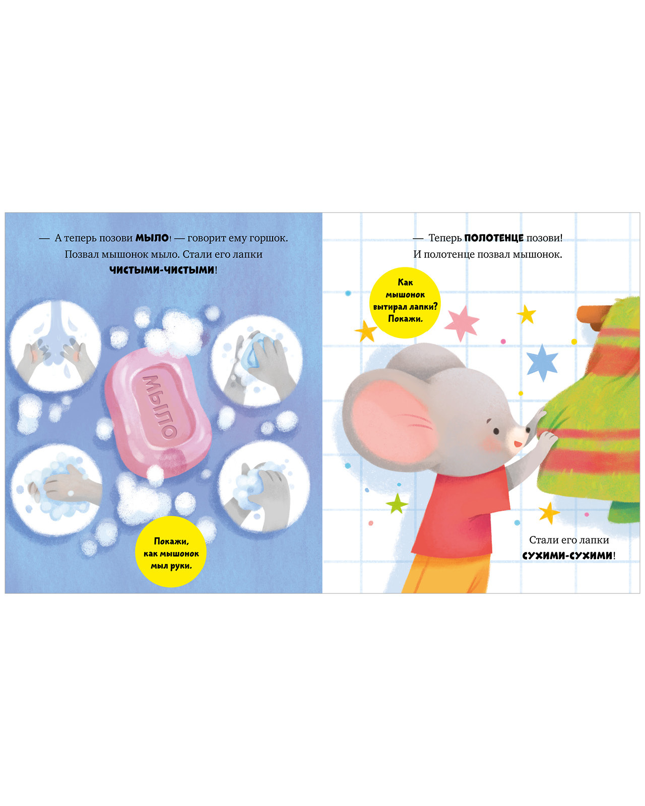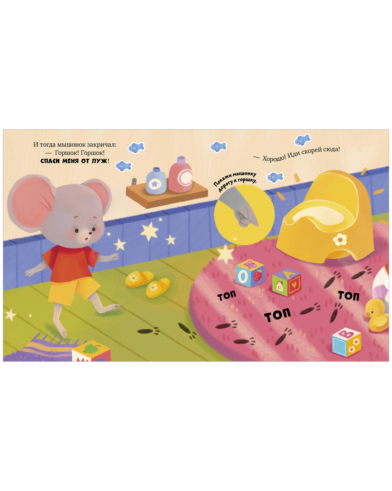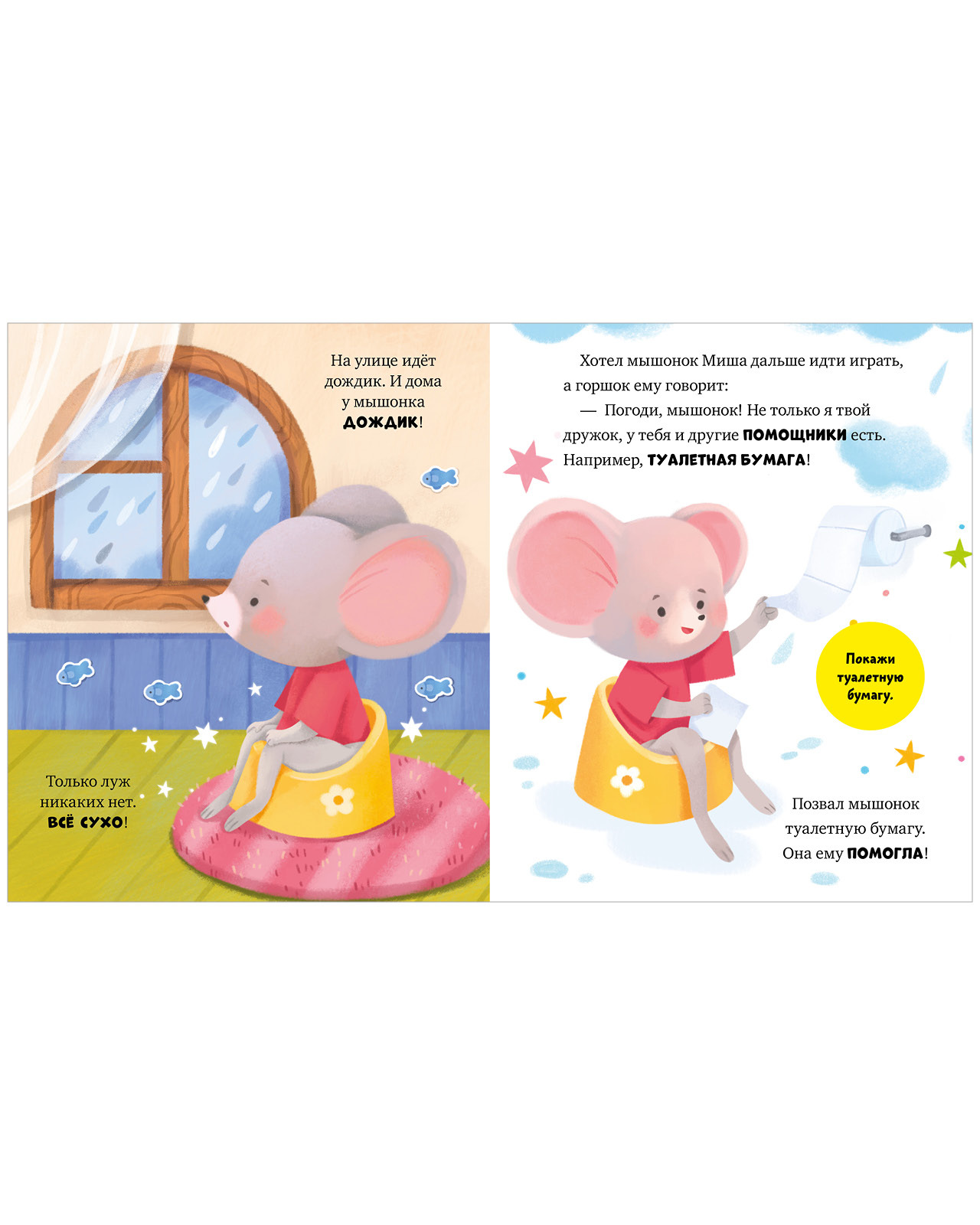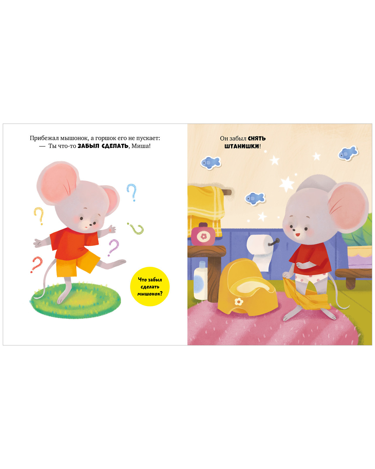 «Мышонок Миша идет на горшок» — симпатичная книжка с большими картинками, которая поможет ребенку освоить новый важный навык и базовые правила гигиены.