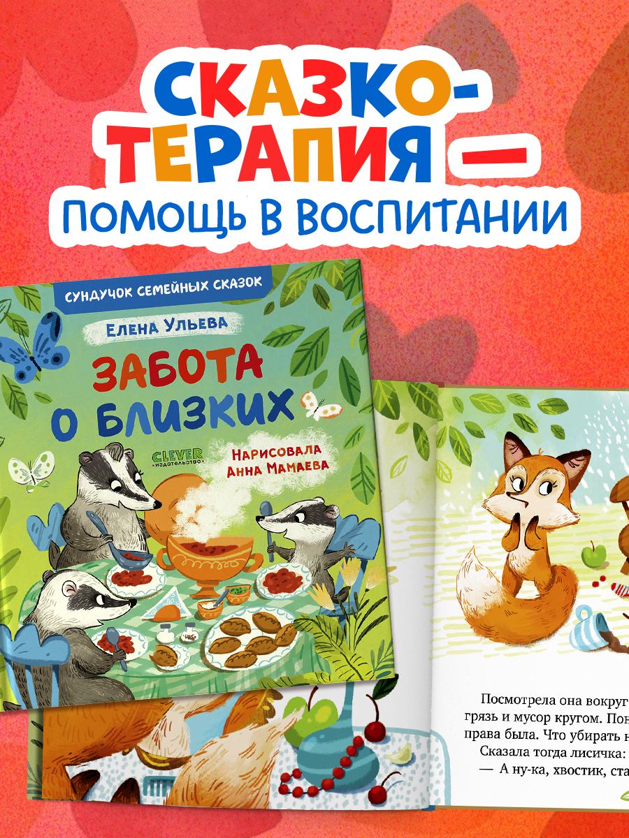 Красочная книга Елены Ульевой «Забота о близких» — терапевтическая сказка для малышей 3, 4, 5 лет. В книжке собраны три добрые поучительные истории, которые помогут детям развивать эмоциональный интеллект, узнать много важного про семью, дружбу, эмоции и заботу о близких.