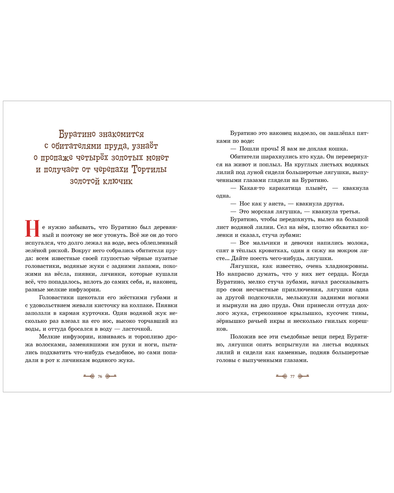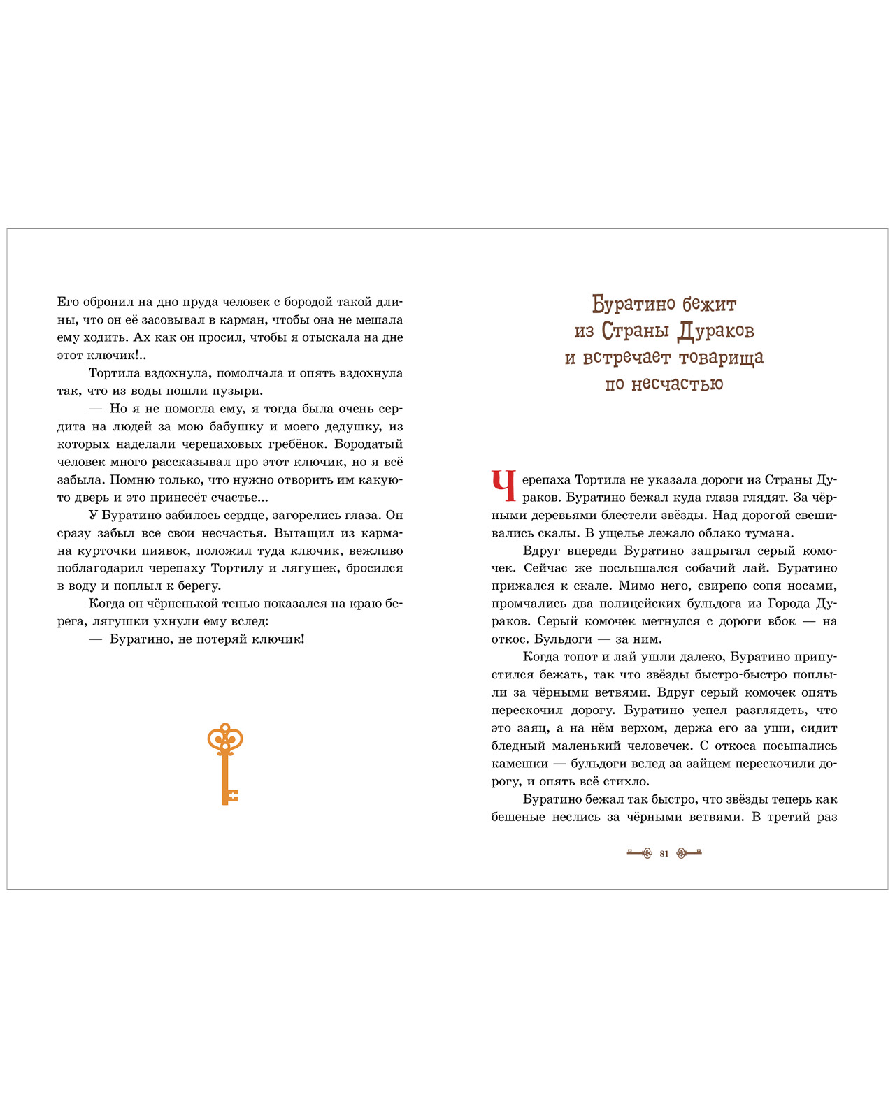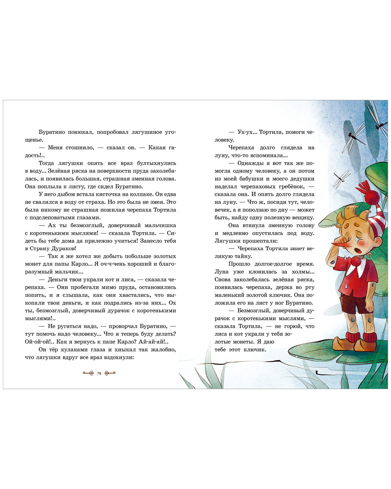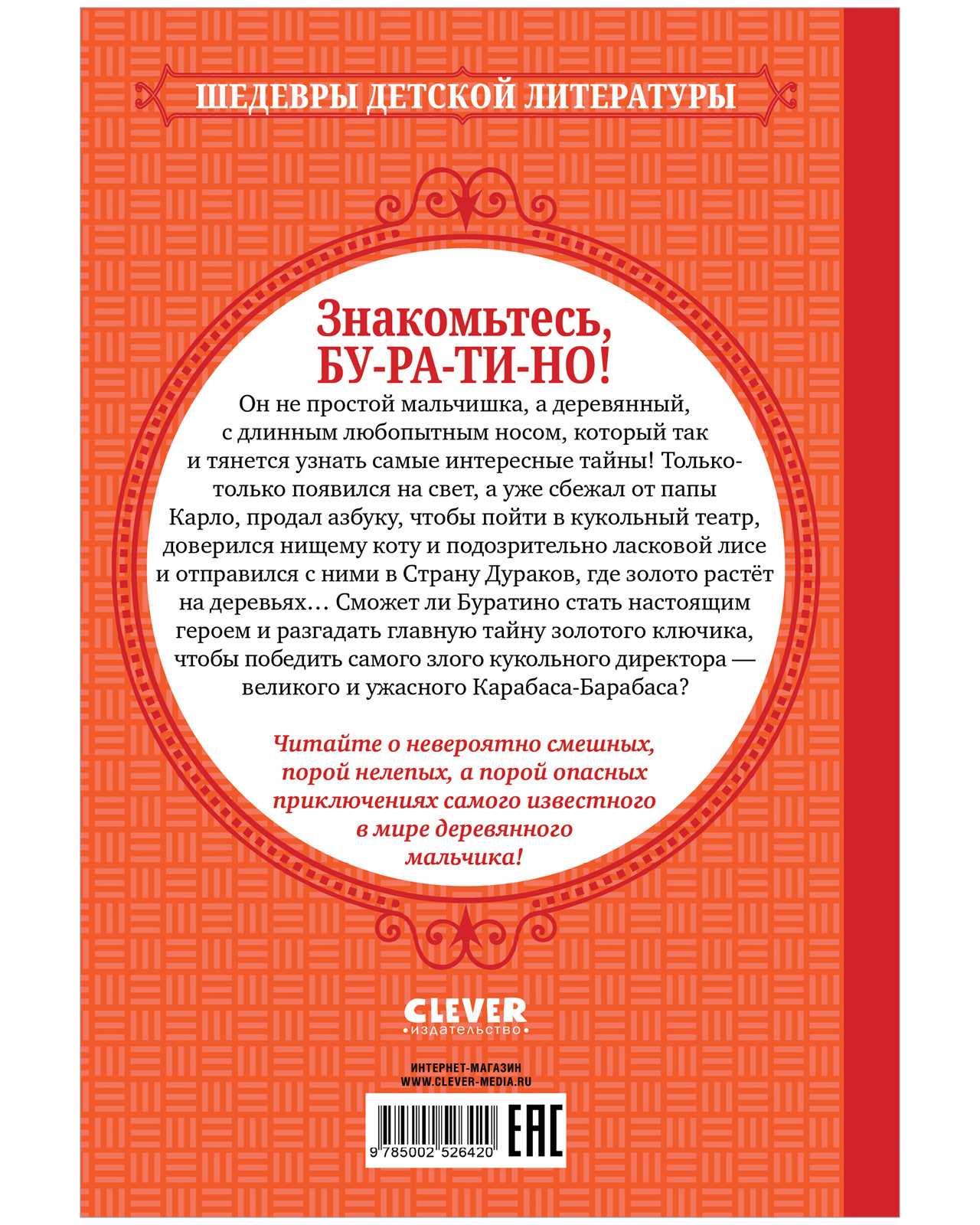 Знакомьтесь, БУ-РА-ТИ-НО! Он не простой мальчишка, а деревянный, с длинным любопытным носом, который так и тянется узнать самые интересные тайны! Только-только появился на свет, а уже сбежал от папы Карло, продал азбуку, чтобы пойти в кукольный театр, доверился нищему коту и подозрительно ласковой лисе и отправился с ними в Страну Дураков, где золото растет на деревьях…