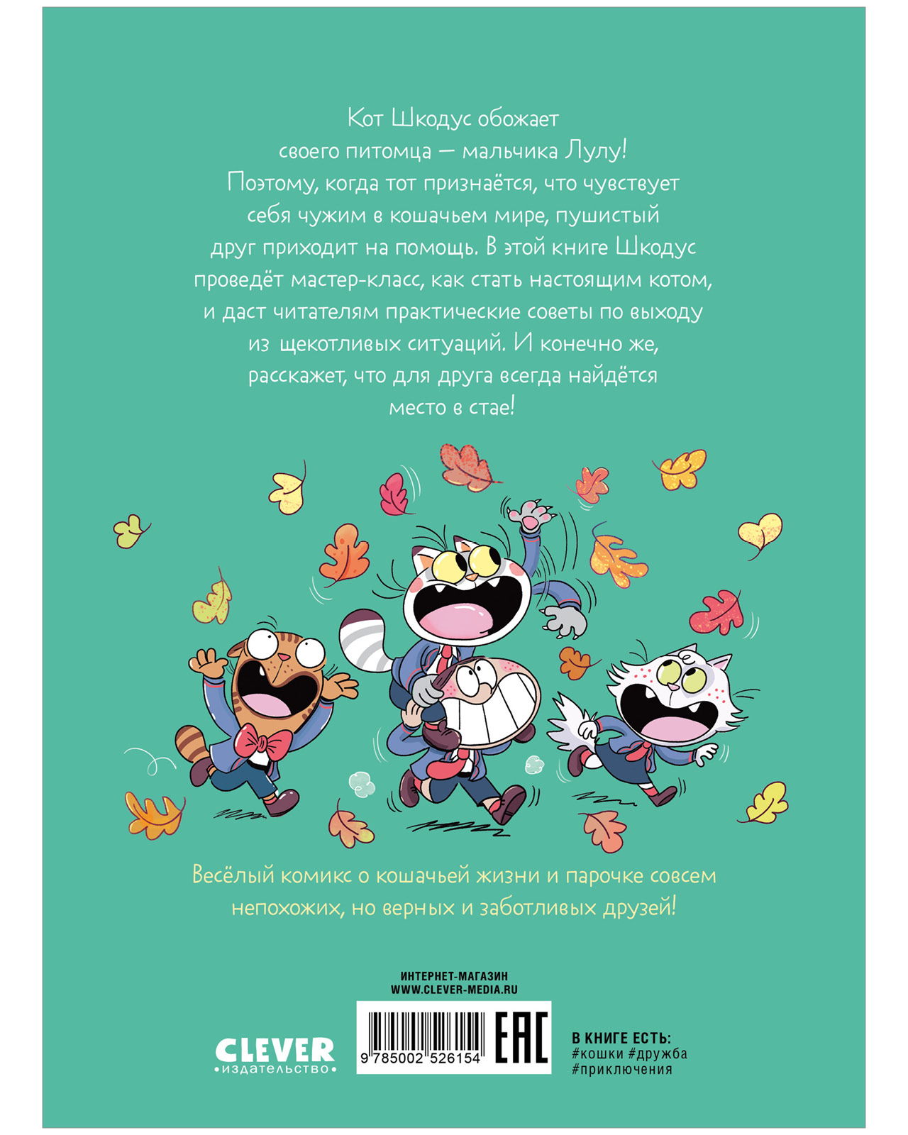 Кот Шкодус обожает своего питомца — мальчика Лулу! Поэтому, когда тот признается, что чувствует себя чужим в кошачьем мире, пушистый друг приходит на помощь. В этой книге Шкодус проведет мастер-класс, как стать настоящим котом, и даст читателям практические советы по выходу из щекотливых ситуаций. И конечно же, расскажет, что для друга всегда найдется место в стае!