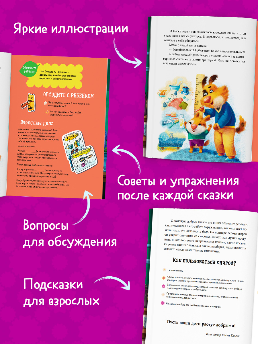 Слушая сказки, ребенок узнает, как важно выручать друг друга и с помощью добрых дел дарить радость и тепло всем вокруг. В этом ему помогут волшебные упражнения. А подсказки для взрослых сориентируют, как пользоваться книгой.