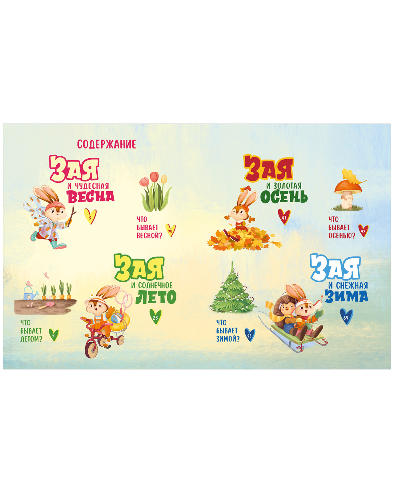 «Большая книга сказок про времена года» — сборник из четырех сказок про весну, лето, осень и зиму с обаятельной любопытной героиней — зайкой Заей.