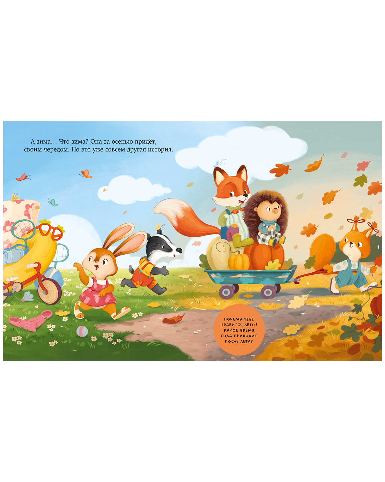 Чтобы новые знания точно хорошо усвоились, в конце книги малышей ждет материал для закрепления — развороты с иллюстрациями и короткими текстами, которые напомнят, что происходит в разные времена года.