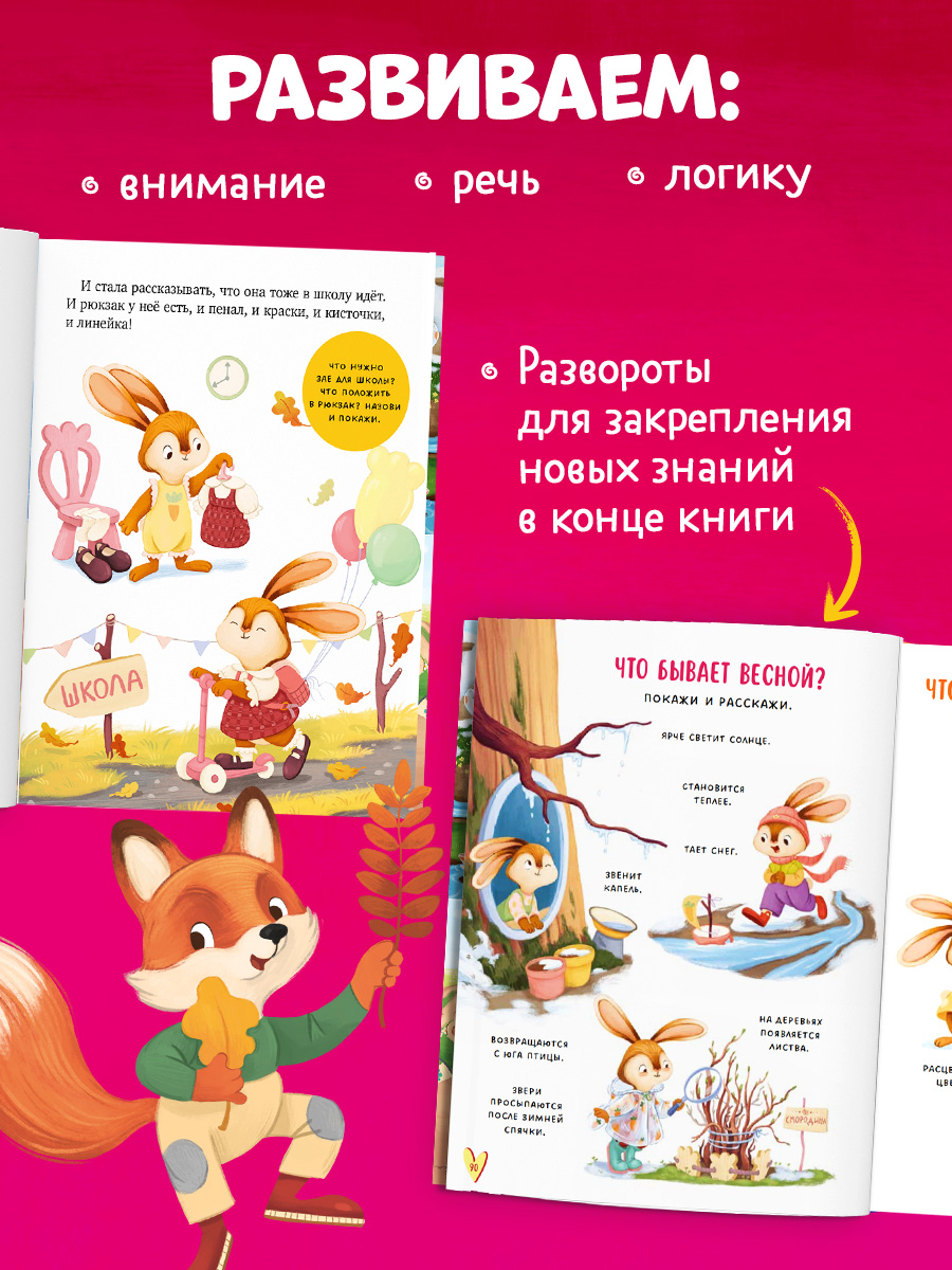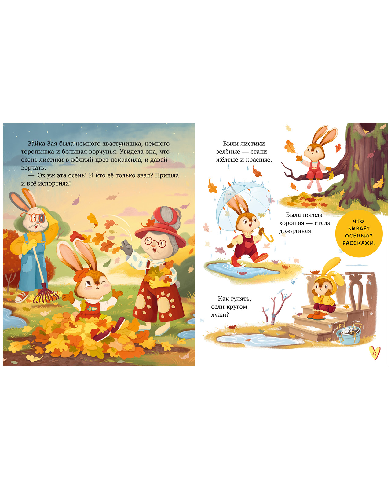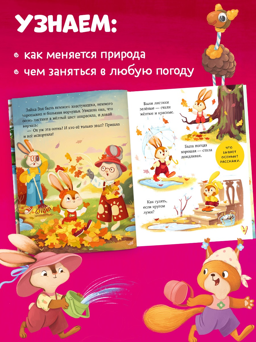 Веселые сказки про зайку расскажут малышам, как меняется природа в каждом новом сезоне и как провести время весело и с пользой в любую погоду. А вопросы и задания на каждом развороте помогут потренировать внимание и речь.