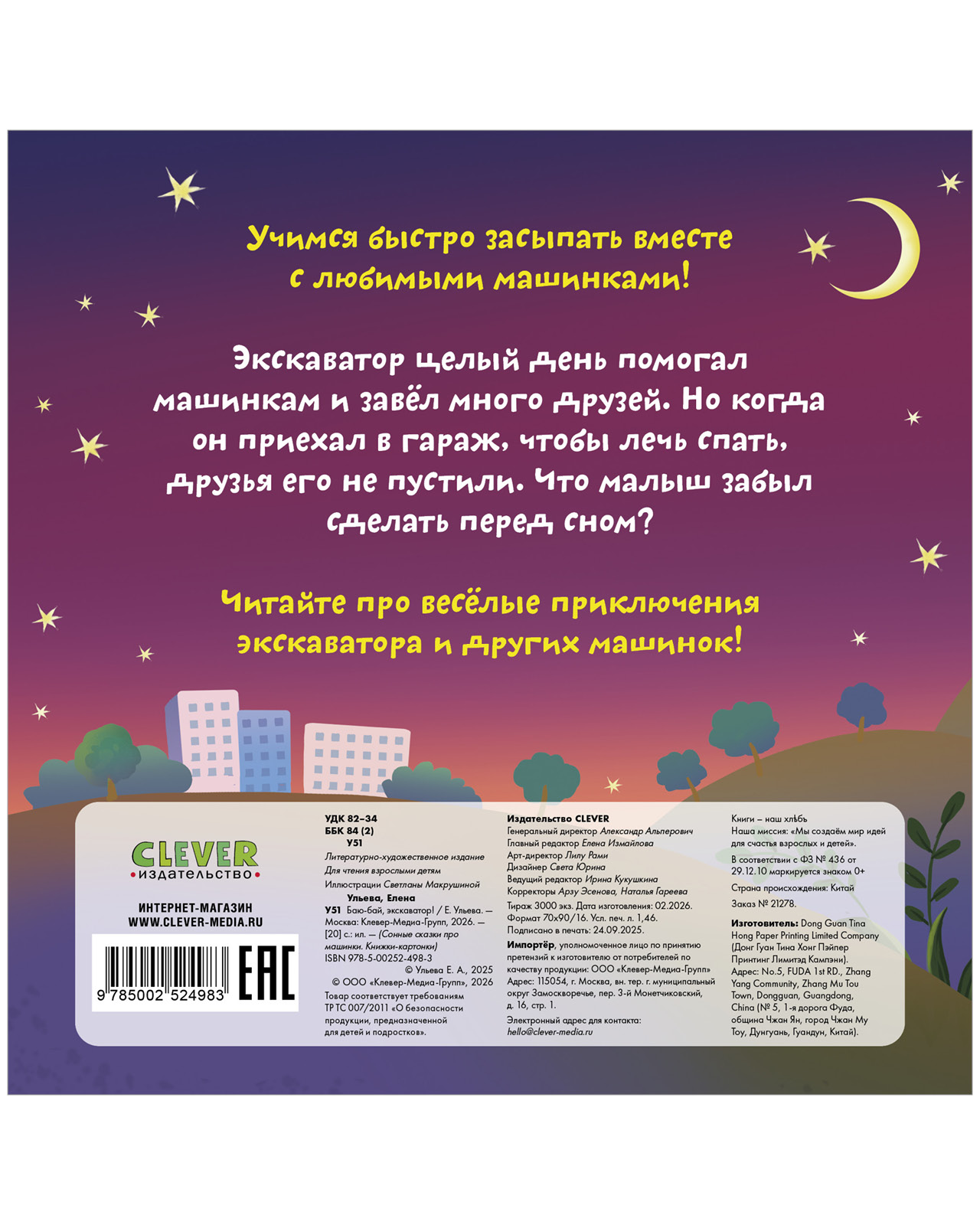 Если вы ищете познавательные книги для детей, детские книги с симпатичными иллюстрациями, уютные сказки для малышей и книги для малышей Елены Ульевой, книжка «Баю-бай, экскаватор» для вас. Это отличный подарок ребенку 2 лет, а также она подойдет, если вы ищете книжки для детей 2 лет, сказки для детей 3 лет и книги для детей 4 лет.