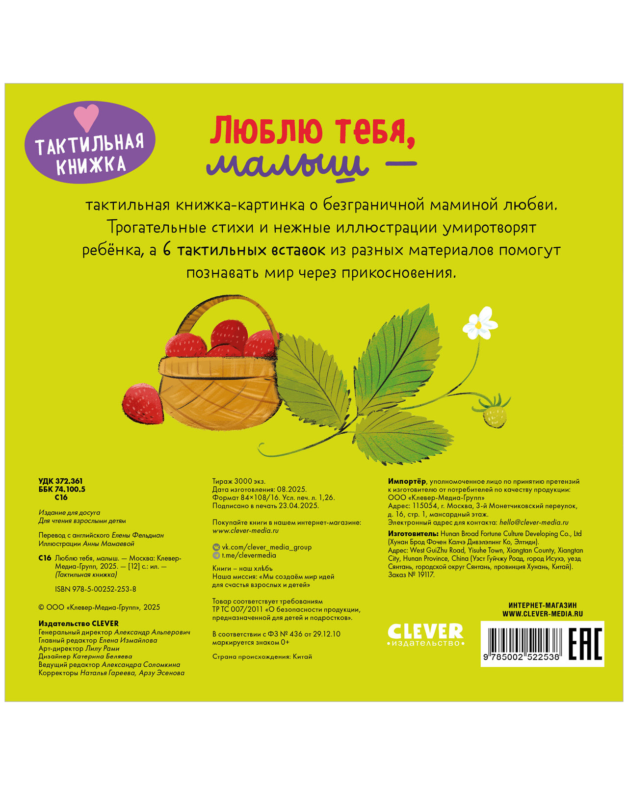 «Люблю тебя, малыш» — уникальная тактильная книга для малышей с нежными стихами и с красивыми иллюстрациями.