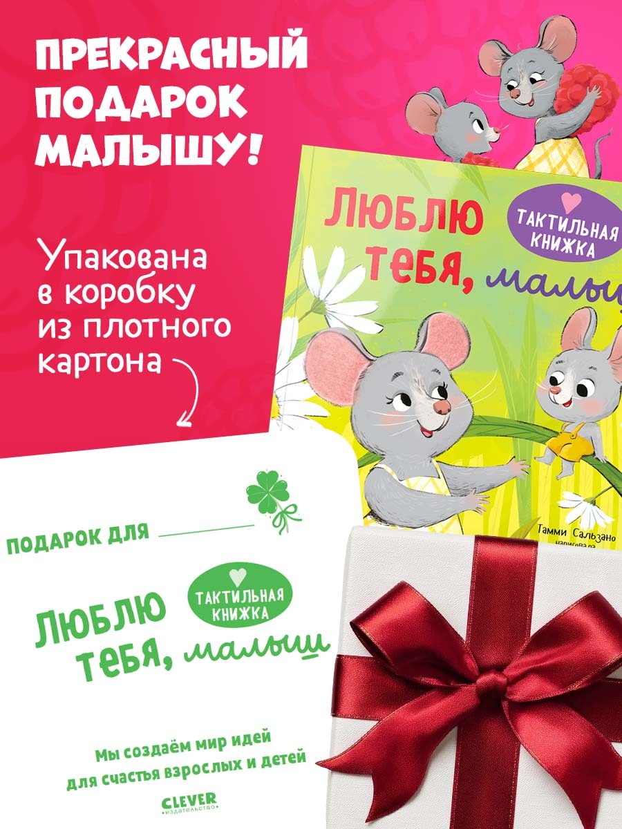 Тактильная книга «Люблю тебя, малыш», которую выпускает издательство Clever, понравится маленьким читателям, она упакована в красивую коробку из картона, и это прекрасный подарок ребенку 2 лет и отличный выбор для родителей, которые ищут книжки для малышей 0-1, интерактивные детские книги, тактильные книги для малышей и другие развивающие книги для детей 3 лет.