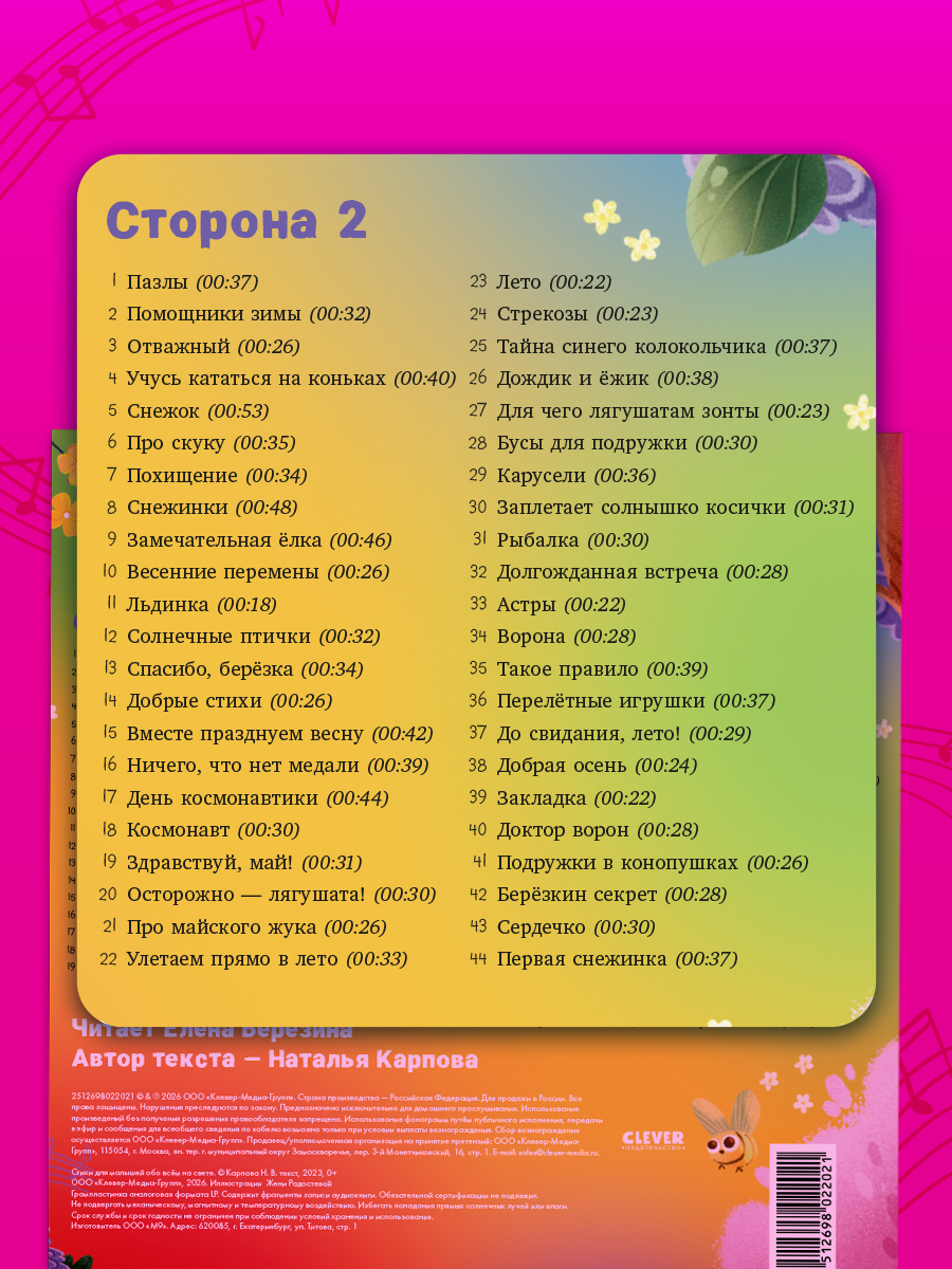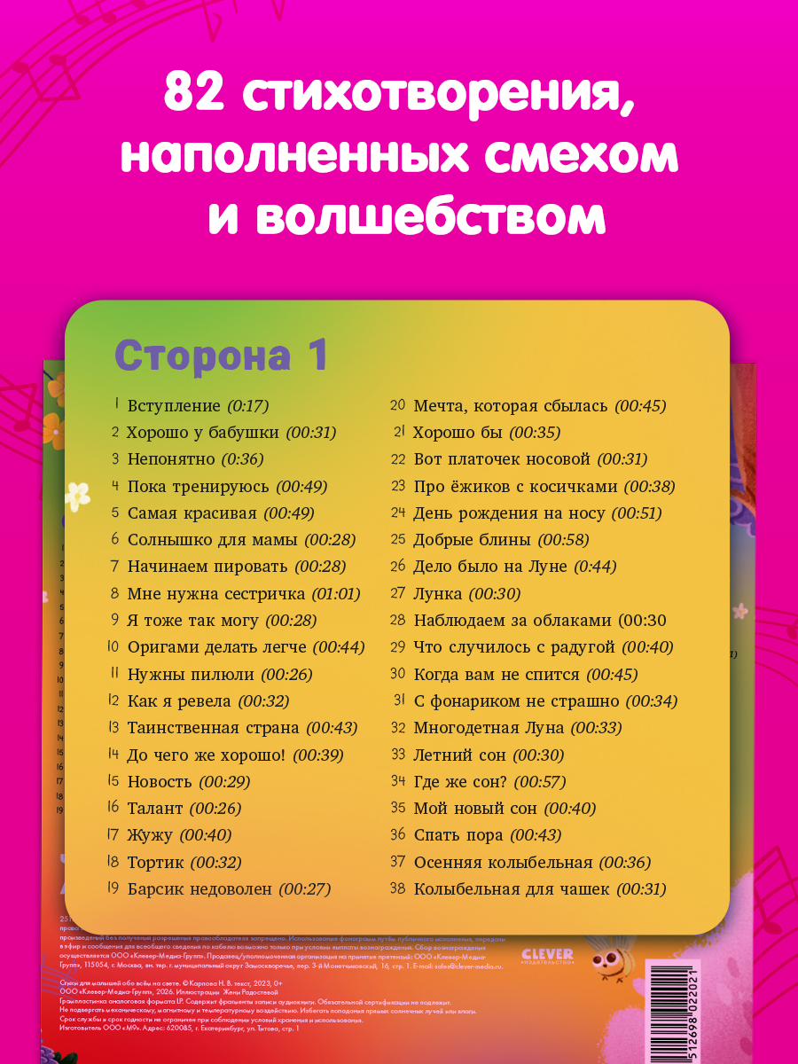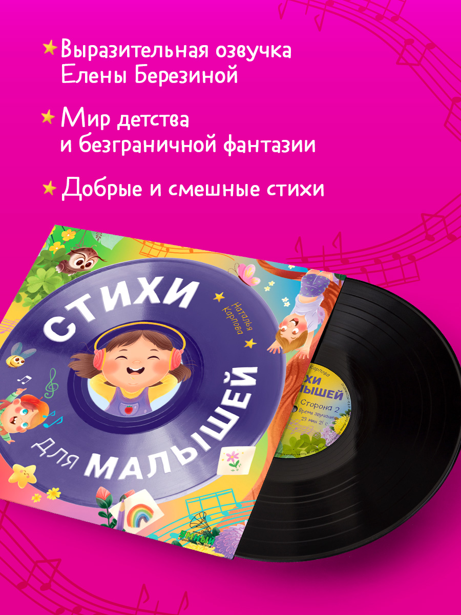 «Стихи для малышей» — сборник добрых и смешных стихотворений Натальи Карповой в аудиоформате. Талантливая озвучка детской писательницы и чтеца Елены Березиной перенесет вас в мир, где живут детские мечты: о море и солнце, бабушкиных оладьях, котенке, конфетах и приключениях. Как помочь лягушатам добраться до пруда? Куда направляется жираф? И как, раскачиваясь на качелях, улететь прямо в лето? Ответ — в солнечных и ярких стихах с этой пластинки!