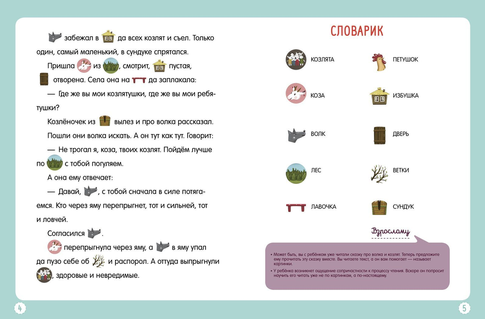 Сказка о непоседливых козлятах понравится даже самым юным читателям. Простые и понятные рисунки, удобный формат, плотный картон, пухлая обложка такую книжку хорошо читать перед сном, а также брать в дорогу или на прогулку!