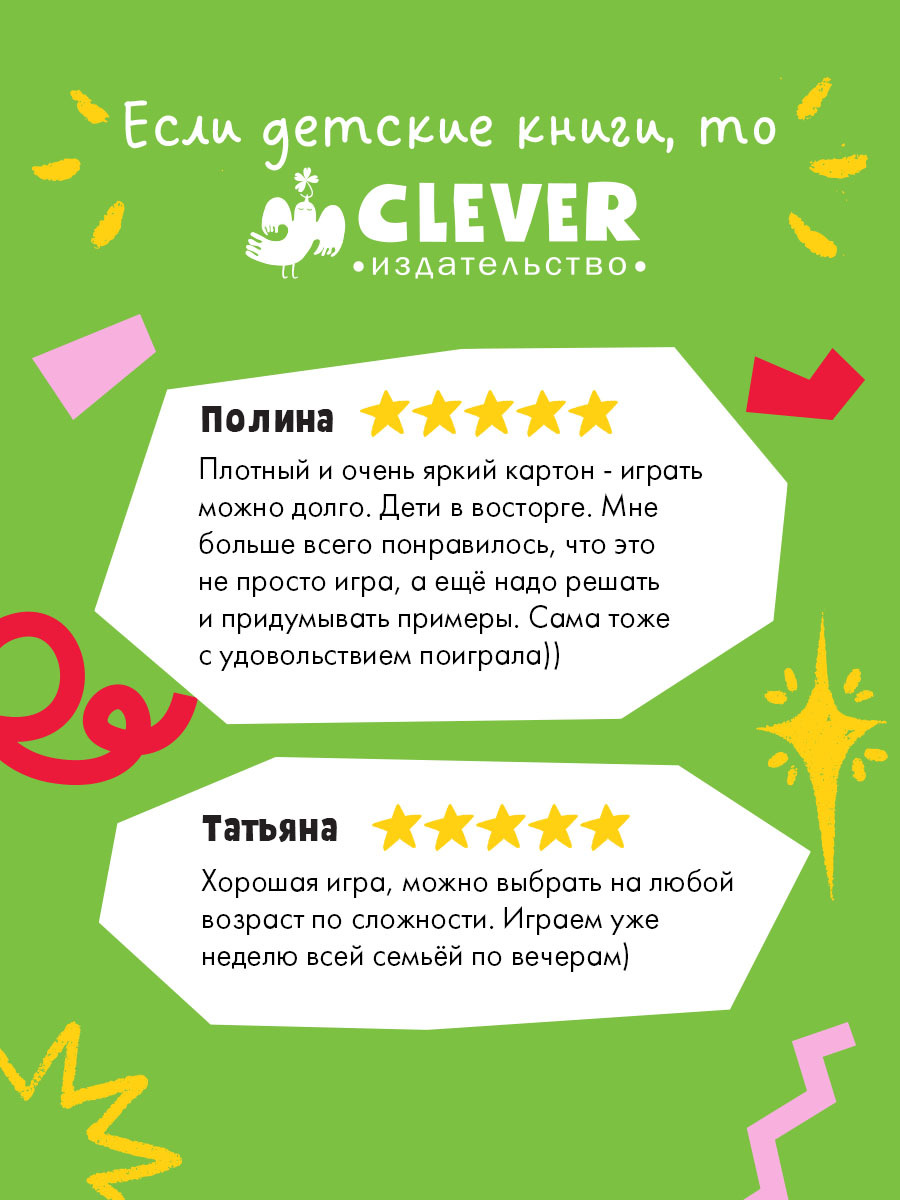 «Космическая математика» включает 5 вариантов игр разной сложности. Основная игра «Планета сокровищ» подойдет как для космонавтов помладше (от 4 лет) в более простом варианте, так и для более взрослых космолетчиков (от 6 лет) — в варианте посложнее. Кроме того, в яркой коробке ждут любимая всеми «Мемори», карточная игра «Осторожно, моноглаз-водолаз!» и «Загадки в бутылке» с математическими задачами.